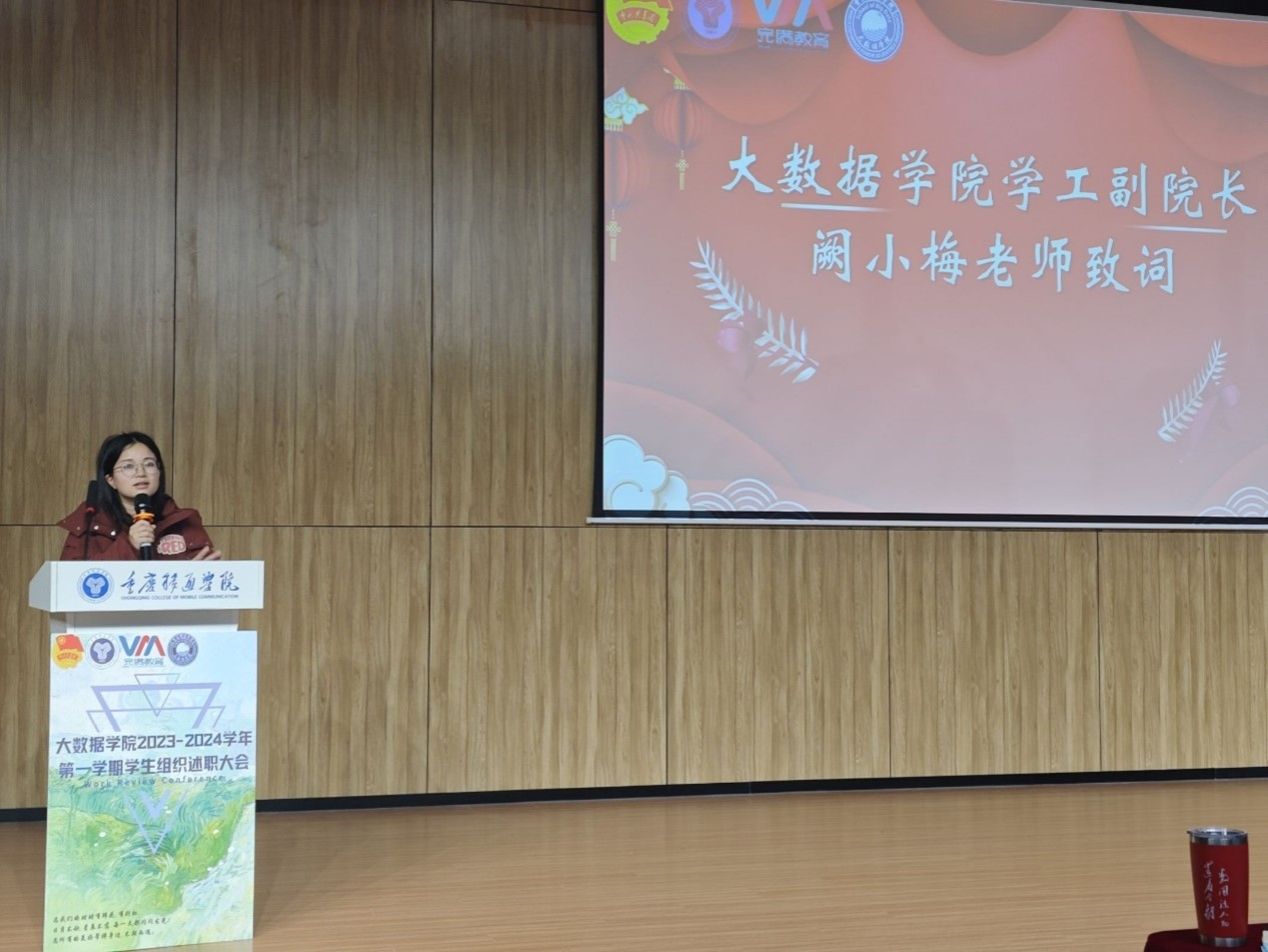 随后,大数据学院学工副院长阙小梅老师进行致辞,对本学期开展完满教育工作的老师、主席、干部和干事们的辛苦付出表示感谢,对其工作的认可给予掌声。同时,提醒同学们需要重视学习与工作的平衡,妥善处理继承与创新的协调,以及学生干部与榜样之间的互动关系。面对困难时应该积极应对。此外,还提醒大家注意寒假期间的安全问题,希望同学们都能在明年的工作中继续努力,取得更好的成绩。