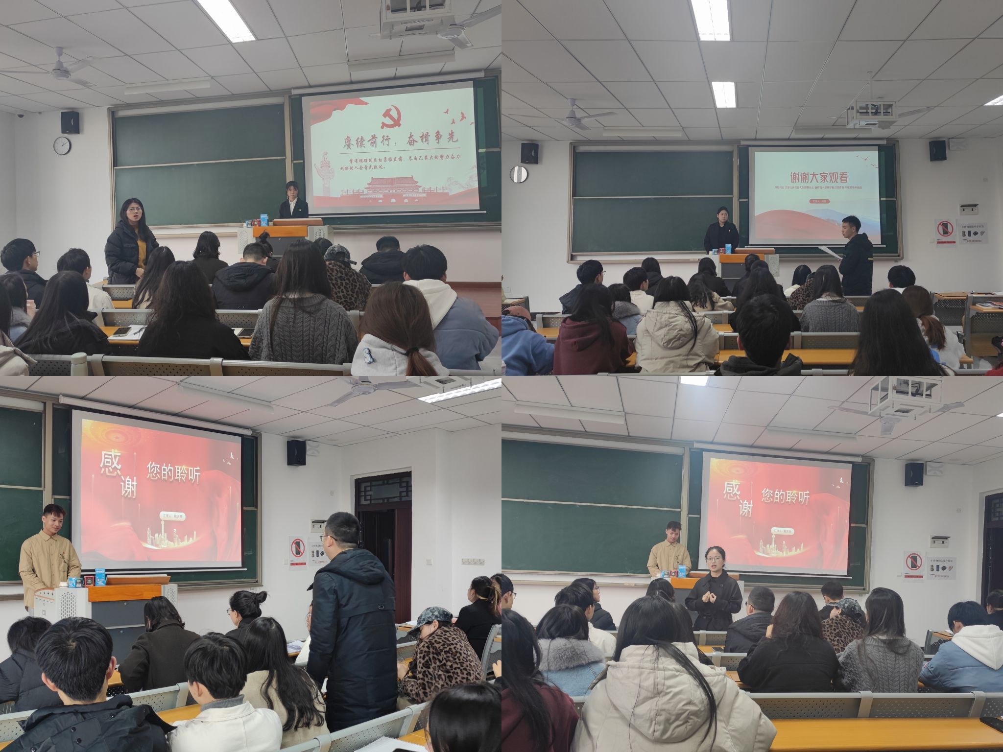 冯扬、万国庆、陈天其三名发展对象依次汇报对党的认识、入党动机、本人履历、以及需要向党组织说明的其他问题,表达了为共产主义事业奋斗的坚定信念和决心,表明会紧跟党组织的培养与教育,加强理论知识学习,充分发挥先锋模范作用。