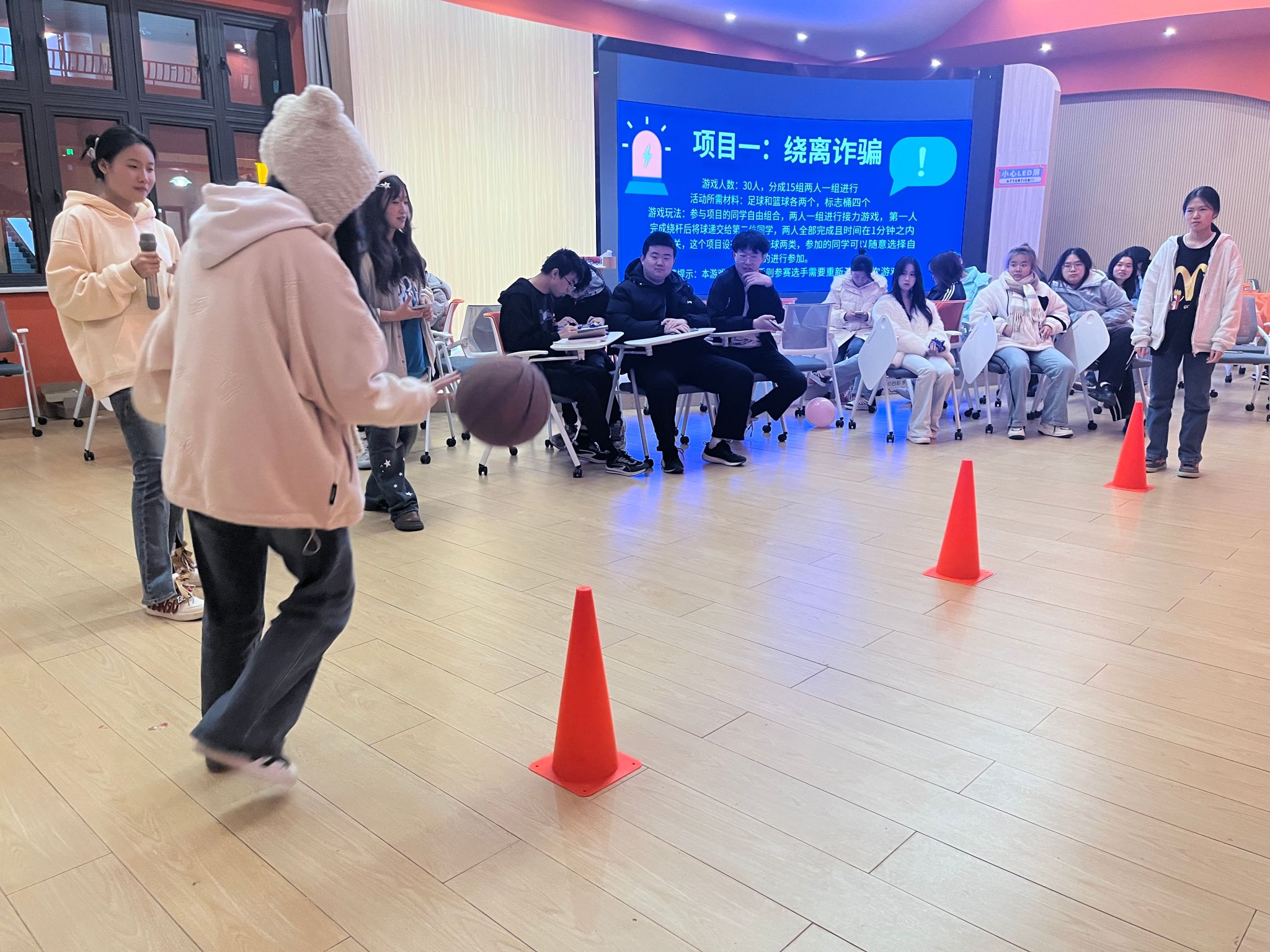 活动进行时,本次活动通过“绕离诈骗”“巧织安全网”“反诈总动员”“反诈联盟”四个小游戏引导同学们在乐趣横生的游戏中加强防诈意识,以此达到举办此次活动的目的。首先进行“绕离诈骗”和“巧‘织’安全网”两个游戏,通过趣味运动的方式让同学们明白反诈的重要性,同时也让同学们擦亮双眼,树立防骗意识;接着进行“反诈‘总动员’”和“反诈联盟‘两个游戏,让同学们明白共建安全校园,离不开每一位同学的努力,希望同学们把反诈意识铭记于心。