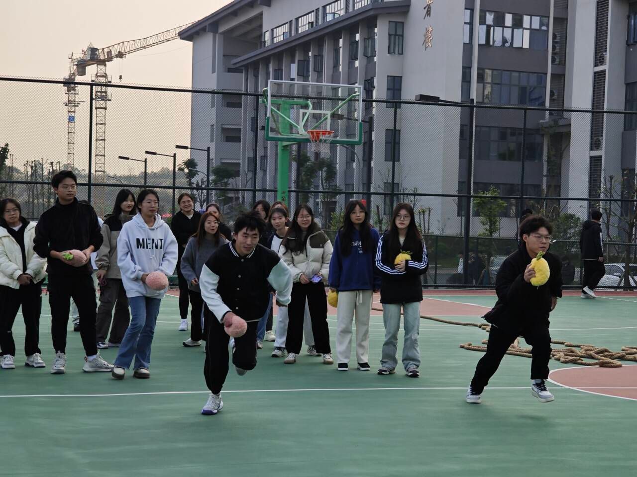 下午四刻,负责布置场地的同学们已经布置好了篮球场,为趣味运动会的顺利进行做好前期准备。本次冬日趣味运动会,共设“谁是幸存者”、“玩偶消消乐”、“拔河比赛”三个团体比拼项目,三个班同学们打乱组建成了两只队伍进行比拼,每一个项目既是智慧和体力的角逐,更是团结协作的完美比拼。