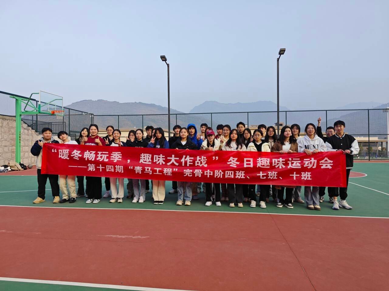 恰同学少年,风华正茂,逞飒爽英姿,青春激扬,为促进青马工程完骨中阶班各班之间的交流合作,加强各班班级凝聚力,丰富学员们的体育锻炼生活,推动校园体育文化精神的发展,让同学们在运动中感受快乐,建立更紧密的同学关系。2023年12月6日下午四时,一场由青马工程完骨中阶4班、7班、10班组织的冬日趣味运动会,在行者楼前篮球场圆满举行。
