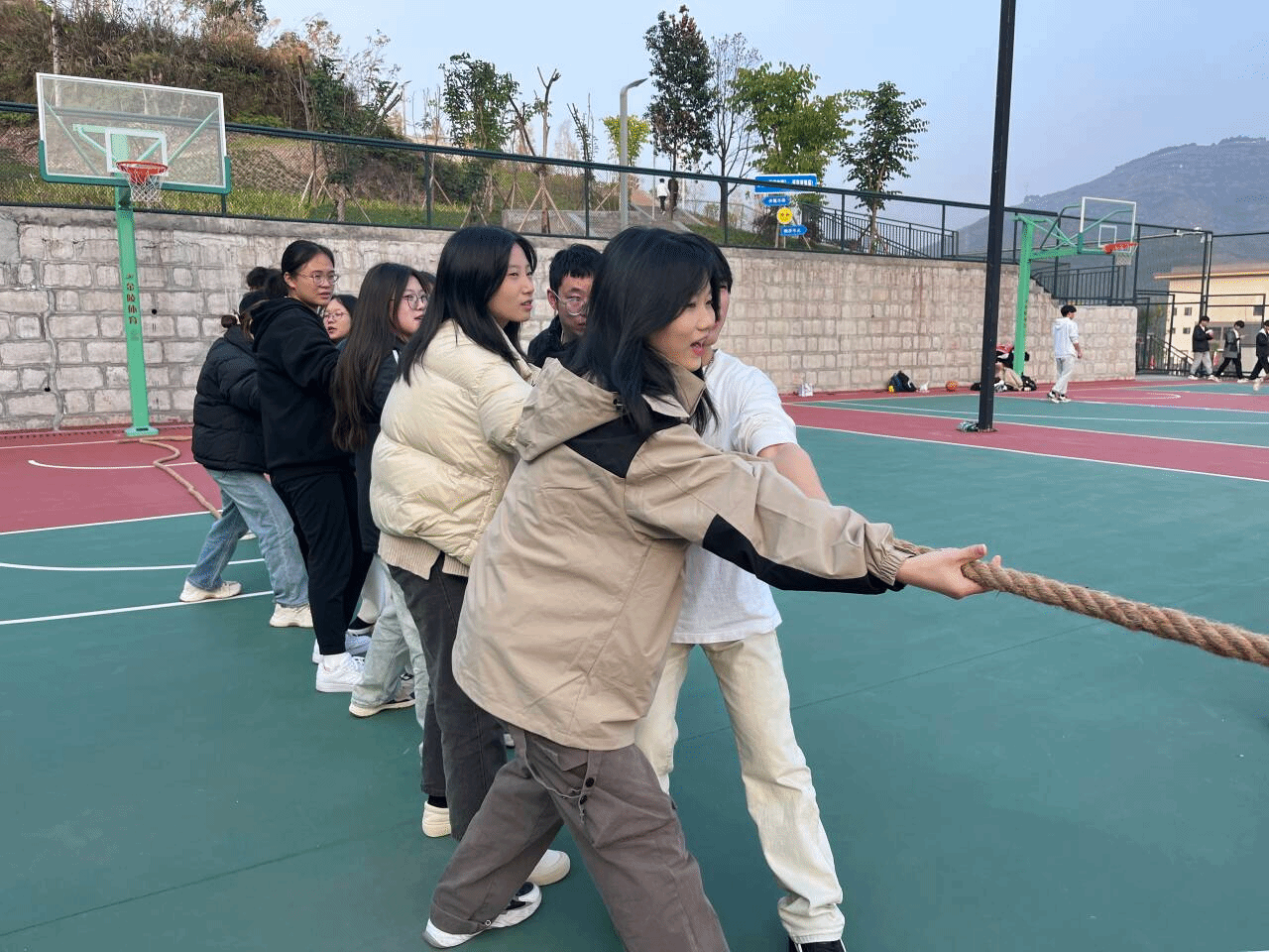 活动进行到最后一项——拔河比赛,同学们带着坚定的信心走上场抓住绳子,各个队伍调整了自己的战略站位,拔河比赛是对体能的考验,也是对团队协作和意志力的较量,经过激烈的角逐,最终决出胜者。