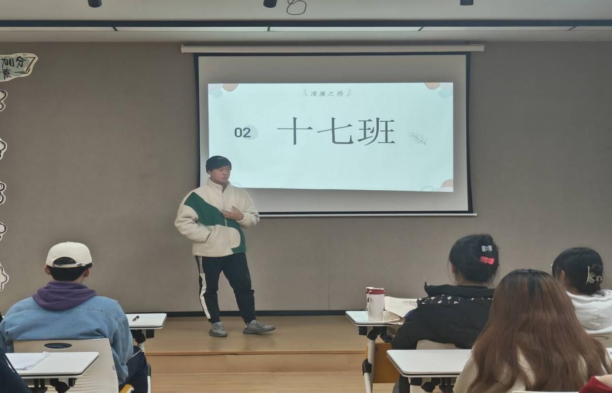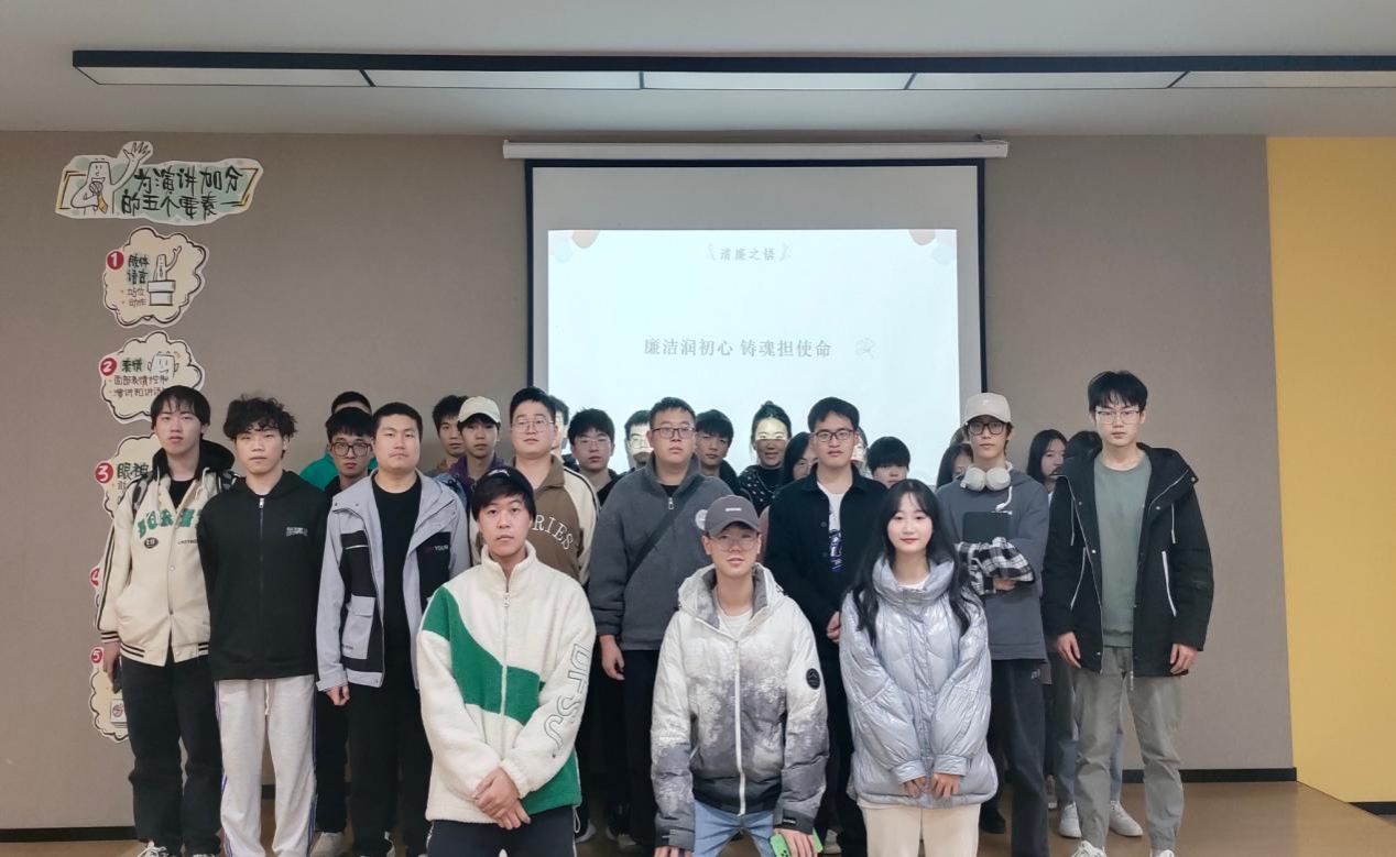 一心为公自会宠辱不惊,两袖清风方能正气凛然。活动由17班班长蒲实担任主持人进行讲解清廉二字,从何为清廉的视频为引逐一解开大家的谜团。何为清廉,为何清廉,著名作家巴尔扎克曾说过:“没有思想上的清白,也就不能够有全能的廉洁。 ”所以,廉洁就是保持清醒头脑,不为欲望所动,是操守,是美德,也是智慧。 认识廉洁,就是塑造心灵之美。讲解完清廉二字,如何扬清廉之风这一问题也游刃而解。作为大学生首先我们要不断加强学习,不断提高拒腐防变的能力。树立正确的世界观、人生观、价值观,树立正确的权力观。其次要提高认识,严格执行规定管住小节。规范自己的行为,努力做到防微杜渐,竖不攀,横不比,扎扎实实管好自己。然后是淡泊名利,正确看待并具有满足感。做到在名利上和待遇上不计较、不攀比、不失衡,严于律己,干干净净做事,老老实实做人。最后接受监督,保障权力在阳光下运行。没有监督的权力,必然导致腐败。