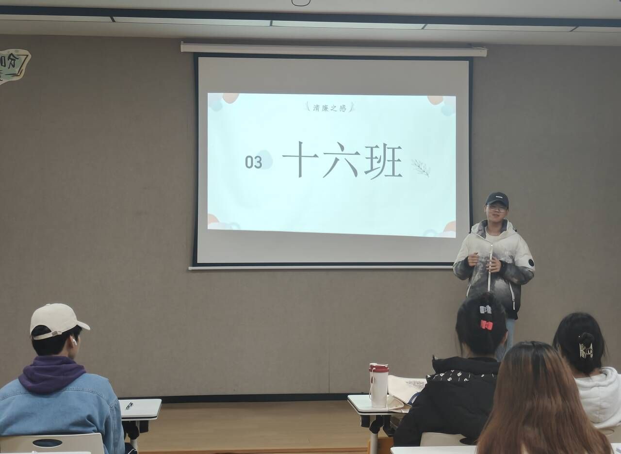 游戏过后,我们开展班委自省,首先“批斗”的是15班,15班班长马静雯制作了一段关于15班全体同学的成长史视频,见证了15班的同学从刚进校园时的青涩稚嫩到现在在各个部门发光发亮,成为优秀的学姐学长。视频过后,马静雯同学也进行了自省,在她担任班长期间是否清廉,是否公平公正。其次是17班班长蒲实,他从主题清廉起讲,讲述了自己在日常工作中的情况,并且阐述了“清廉”在社会中的重要性,最后表明希望能更进一步解决同学们的各种问题和疑惑。最后是16班班长樊国君,从自我约束: 建立自律的生活方式,不做违反道德和伦理底线的事情,保持良好的品行。不作弊和抄袭: 保持学术诚信,不参与作弊和抄袭,树立对知识的敬畏之心。学习廉政知识: 学习有关廉政、反腐败等方面的知识,提高对廉政问题的敏感性。最后提出了期许希望同学们在今后有则改之,无则加勉。