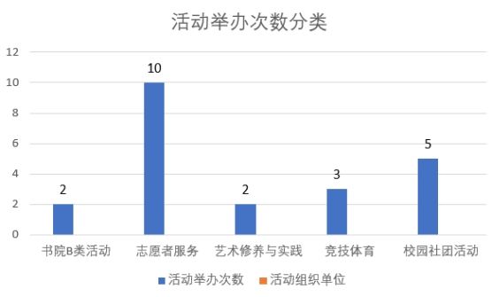 通过下表可以直观看出,我院完满教育版块活动依旧有条不紊的开展着。在11月举办特色完满教育活动共计22场。11月完满教育活动较之10月涵盖范围更加广阔,包括竞技体育、书院建设、校园社团、志愿者服务和艺术修养与实践等。这些活动相互补充、相互促进,为学生提供了全方位的教育体验和发展机会。其中,志愿者服务活动举办次数最多。