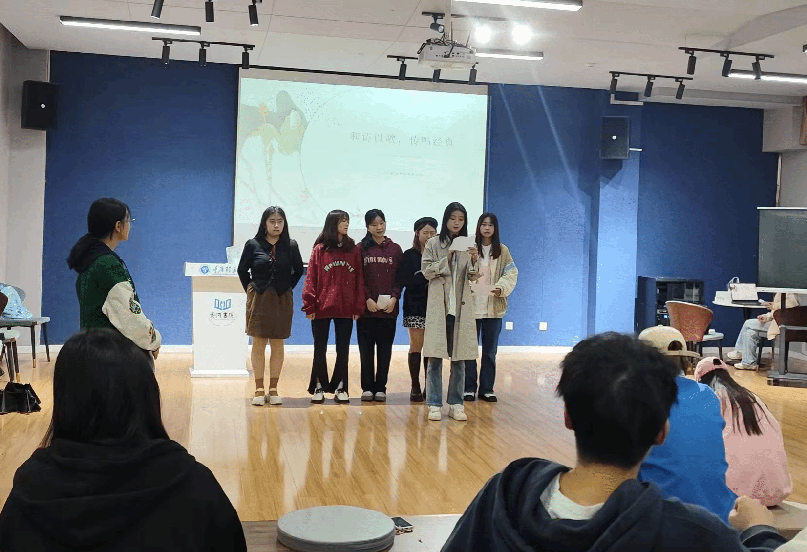 五位同学声情并茂,声音坚定而有力量,向我们娓娓道来,她们的声音里一遍一遍传递出对祖国的爱,展示青年的朝气蓬勃,热情澎湃,朗诵完后同学们热烈的鼓掌是认可是感动。