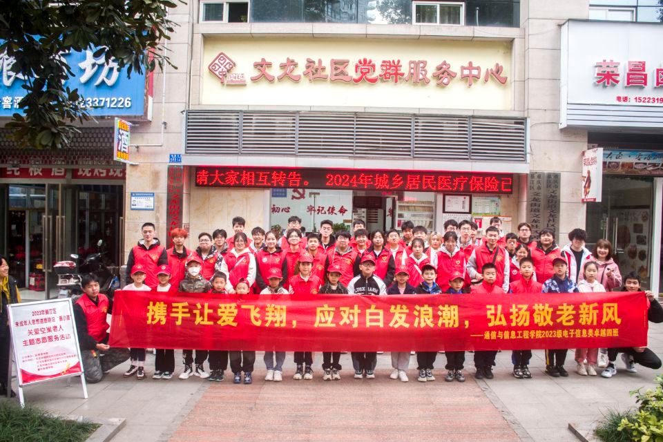 随着社会的发展,老龄化问题日渐突出,空巢老人的现象也日益严重,为了提高空巢老人们的幸福感,减轻心理压力,降低孤独感,感受社会的关心和温暖。2023年11月18日9:00,2023级电子信息类卓越4班在綦江区文龙社区成功举办了以“携手让爱飞翔,应对白发浪潮,弘扬敬老新风”为主题的班团活动。