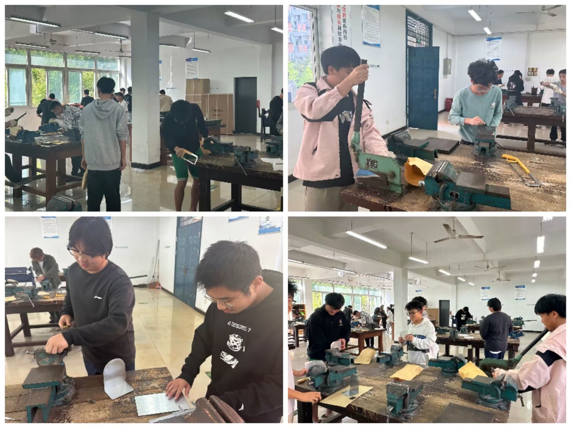 与此同时,远景学院2022级03团支部还给小朋友们带来了一份有意义的“礼物”,利用他们周末时间走进金工实习处,用自己所学专业知识,用锉刀,铁锤,锯条,抛光轮,游标卡尺等工具制作成的书立。通过绘图,然后根据作品图纸要求下料,选择一面划线,随后用剪板钳剪出圆弧轮廓,根据图纸要求先用粗齿锉锉出圆弧及R角,再钻孔,并去锐边及毛刺,然后折弯,最后利用专用字钉在作品面上敲出要求字体,他们用自己所学专业用心做出了一份份“沉甸甸”的礼物。