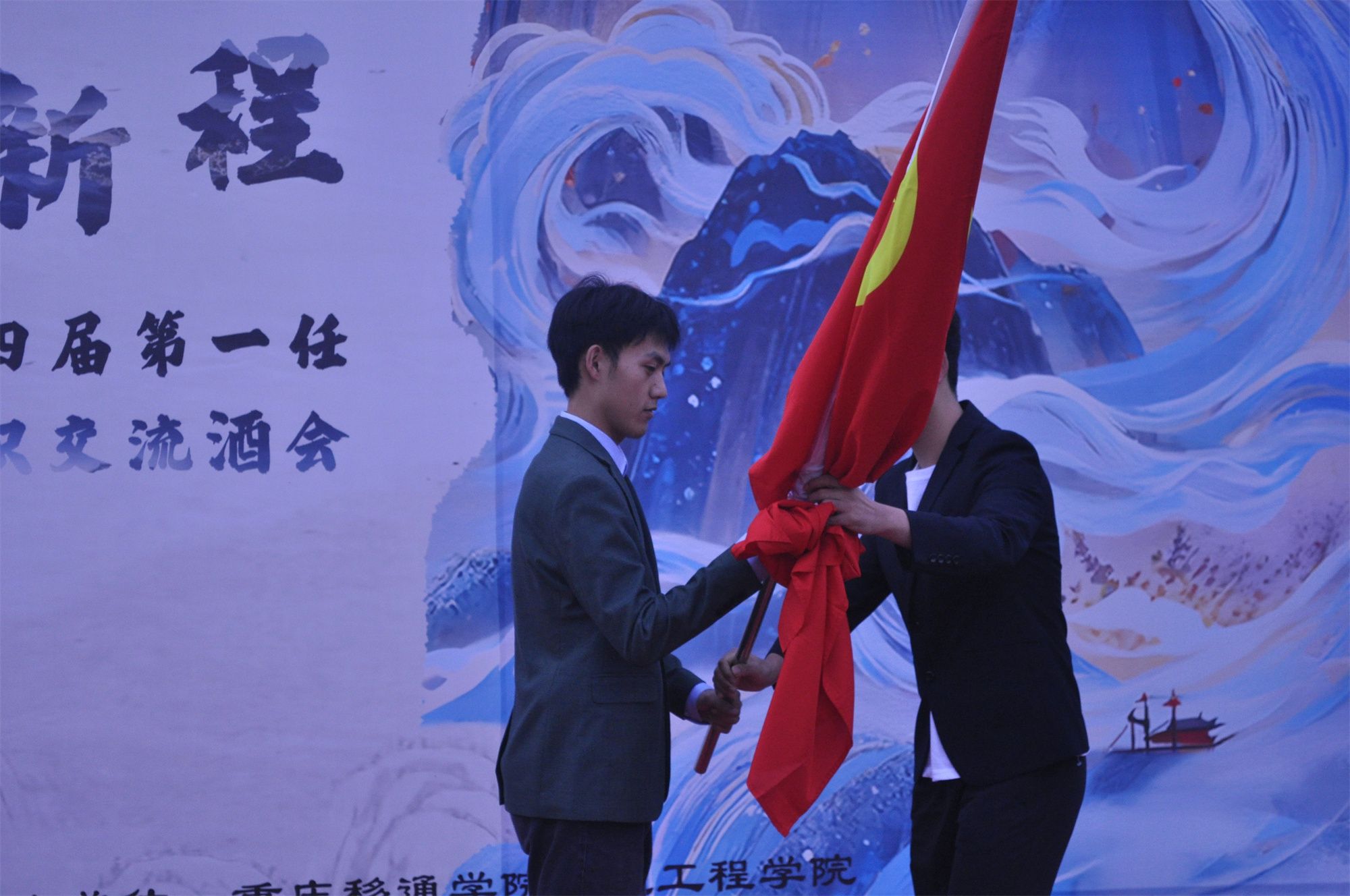 酒会的第五项内容是团旗交接,由第三届第四任团总支学生副书记杨宇杰向第四届第一任团总支学生副书记孙思源授旗,在不断挥舞的团旗中呈现出亮色的一抹红。接着由部长代表刘佳欣同学进行发言,在学生组织工作的一年里,让大家学习到了很多,正如刘佳欣同学所说的,从最初零基础到现在熟练的掌握推文排版技术,都是自己一步一个脚印摸索和学习过来的,不仅仅是工作上得到了进步,在其他领域也得到了不小的提升。