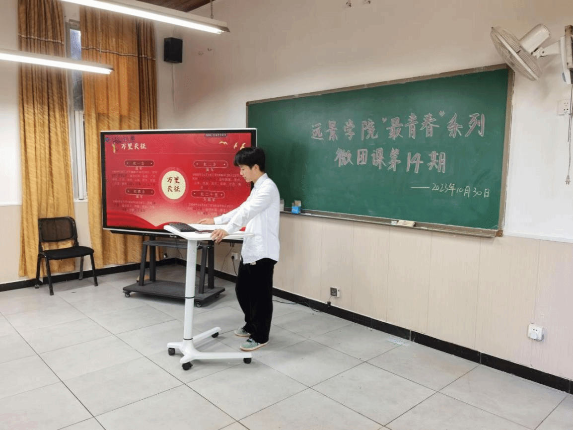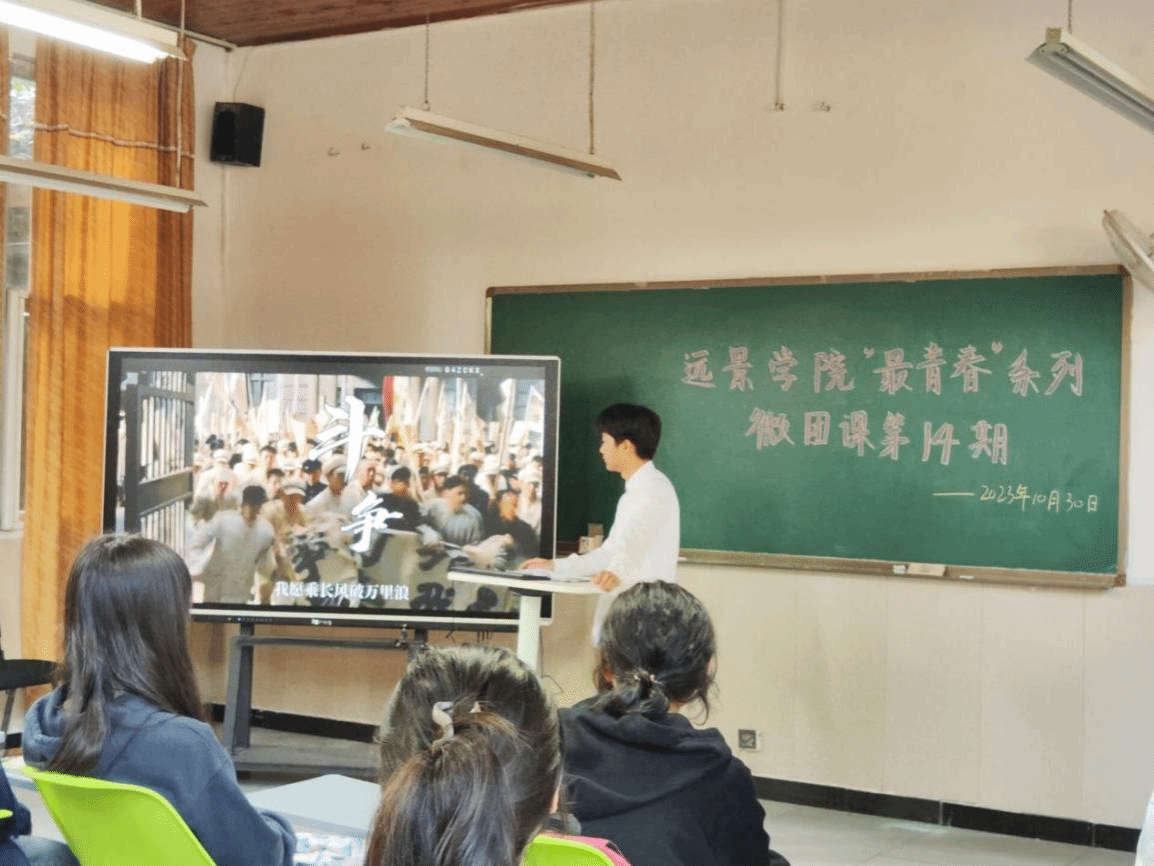 为了深入学习贯彻习近平总书记对青年的寄语,传承红色记忆,弘扬长征精神,加强对青年团员的思想政治教育,引导学生争做红色文化的继承者和传播者,激励广大青年团员将自己锻造成堪当民族复兴大任的一代新青年,2023年10月30日中午12点,远景学院在菩提书院普通教室五开展了“牢记长征精神,不忘奋斗初心”主题微团课。本期微团课邀请到远景学院组织部部长郭浩然同学担任主讲人。