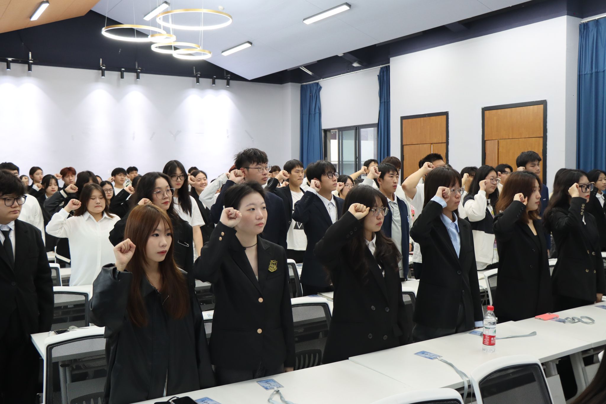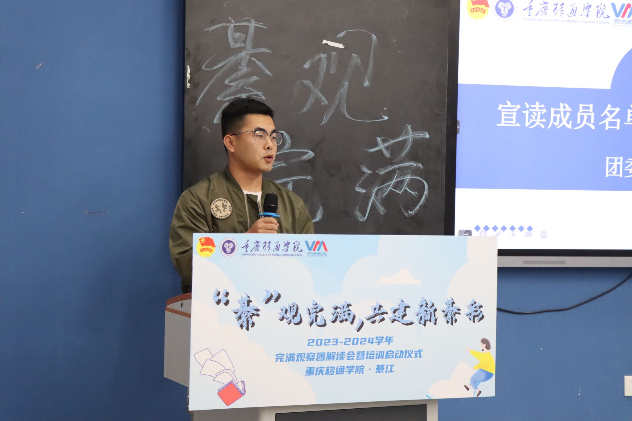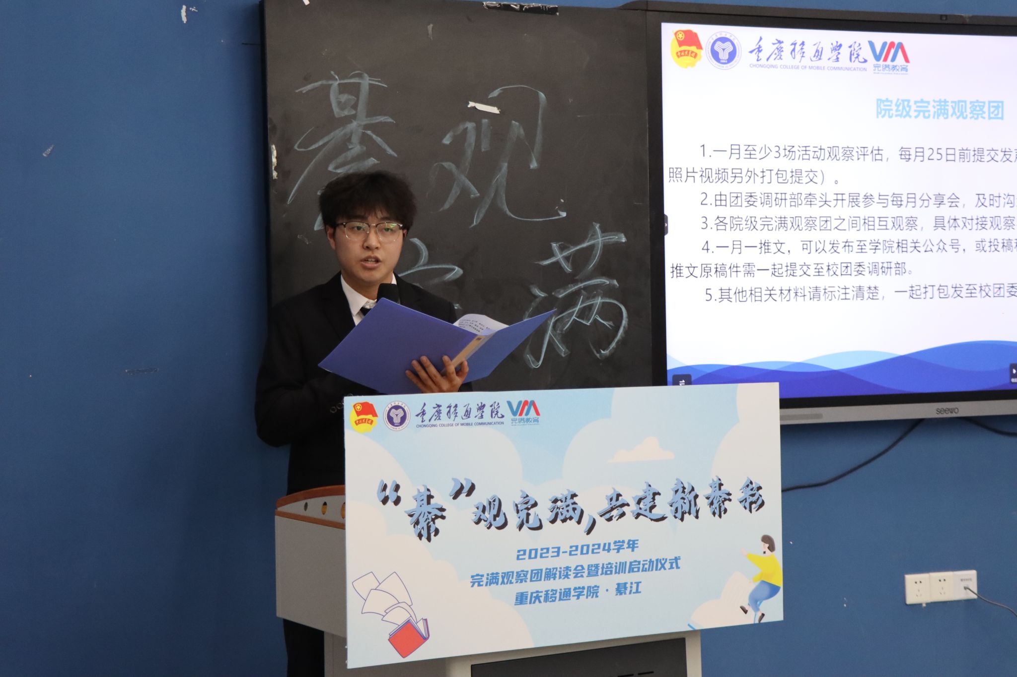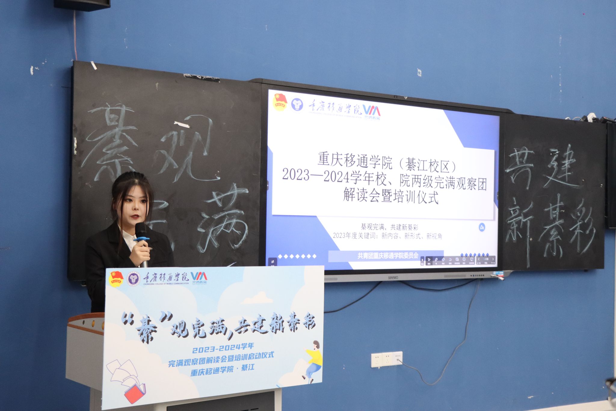 2023年10月13日校团委调研部在綦河书院二号楼智慧教室举办重庆移通学院(綦江校区)2023-2024学年校、院两级完满观察团解读会暨培训启动仪式。出席本次启动仪式的有校、院两级完满观察团指导老师20余名和学生代表180余名。由团委调研部学生干部庞梦婷主持本次会议。