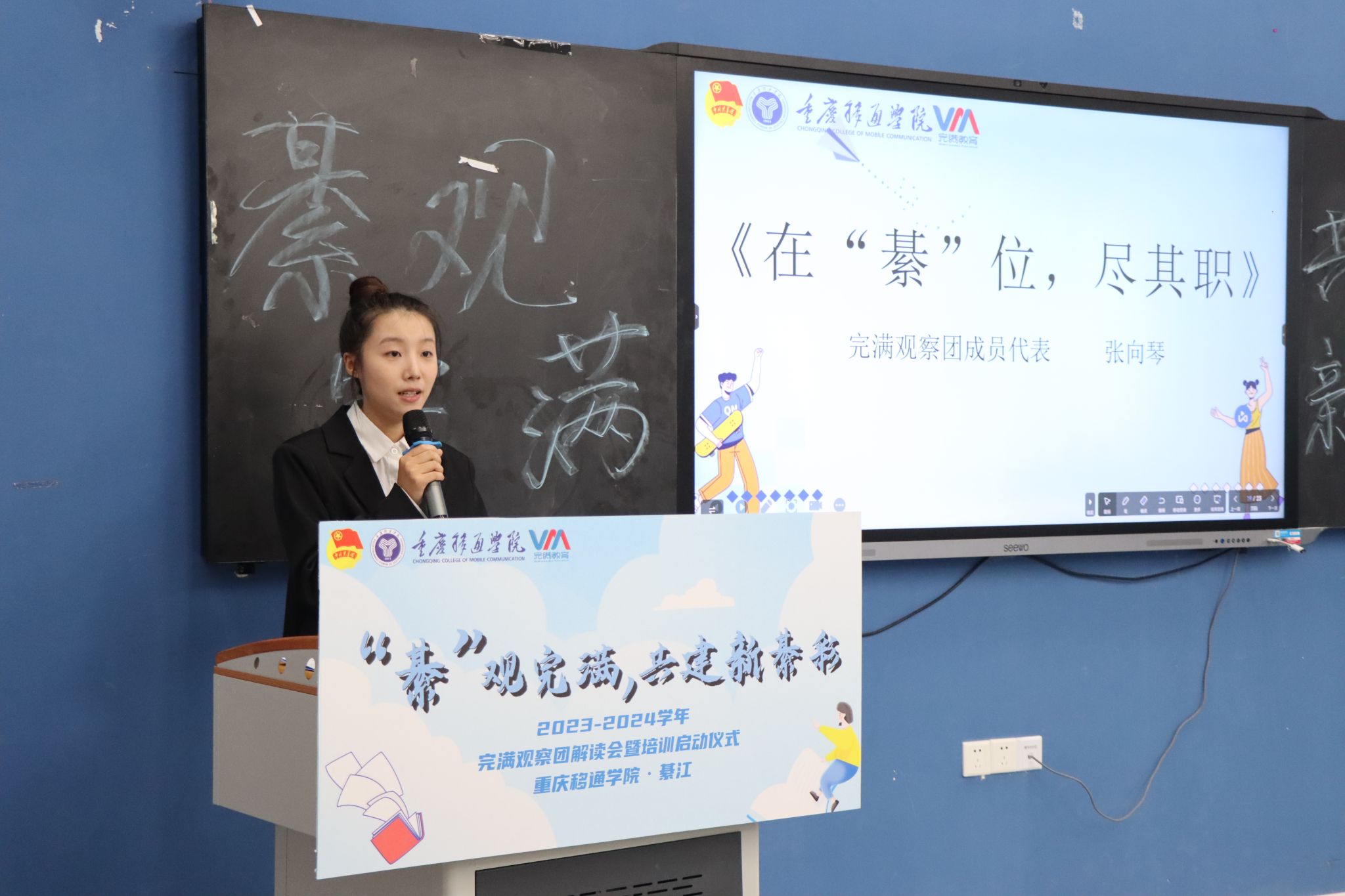 “俱怀逸兴壮思飞,欲上青天览明月”。完满观察团成员代表张向琴同学认为:成为一名完满观察员,能更好的从同学们中来到同学们中去,去更好的观察完满教育活动中的闪光点、不足点。完满观察员要常与组织者们沟通,让活动取其精华,去其糟粕,共建完满“綦”观。最后,张向琴同学对新一届完满观察团进行寄语:希望新一届的观察员们当好观察员,观察好活动,提高观察质量,助力綦江校区完满教育活动蓬勃发展。