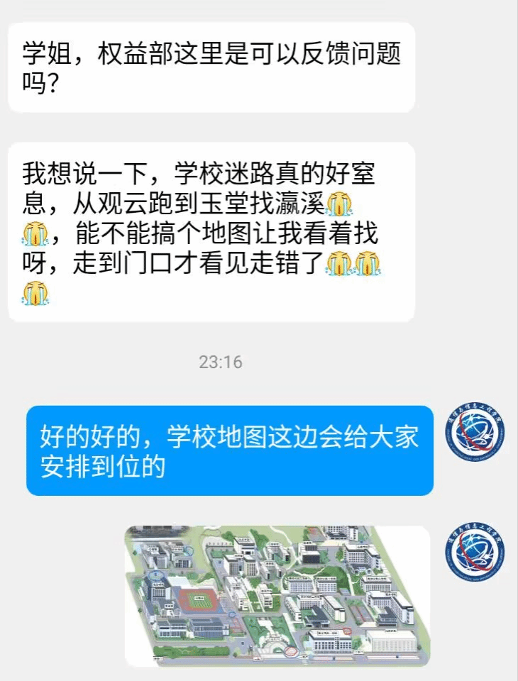由于学校扩建,加上大一新生对学校的不熟悉,有的新同学向我院部门反映,学校太大太陌生,会经常性迷路,跑上跑下却没找到目的地。对于这一问题,通信与信息工程学院学生会权益部部长商讨过后,一致认为这一问题确实频繁,故提出提供地图,安装路标等相应解决方案,相信很快这一问题将会解决的。