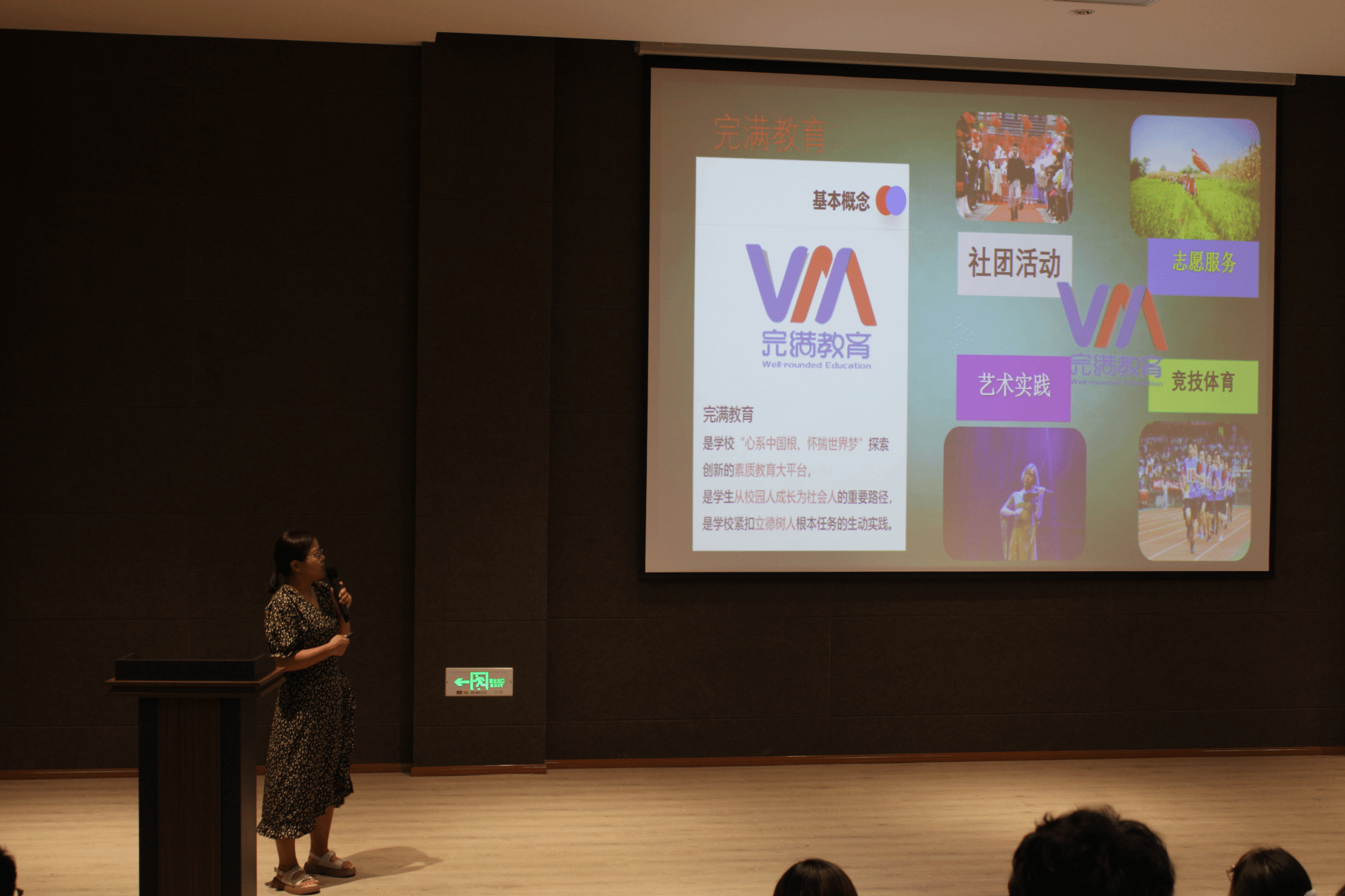 辅导员老师们组织全体同学进行完满宣讲,通过展示社团活动、志愿服务、艺术实践、竞技体育四个版块的大型活动,引导新生深入了解完满教育。从关注学生未来的角度,重塑学生的学习方式,培养学生具有饱满的人格和情感,使他们的生活、工作更加充满色彩、富有温度,进而更好的适应和应对时代变革、技术革新,更好的应对时代和新技术的发展。力求学生通过完满教育具备获得职场的竞争力、生活的创造力、人生的经营力,从而更好的掌握生活、理解生活和享受生活,拥有高质量人生。