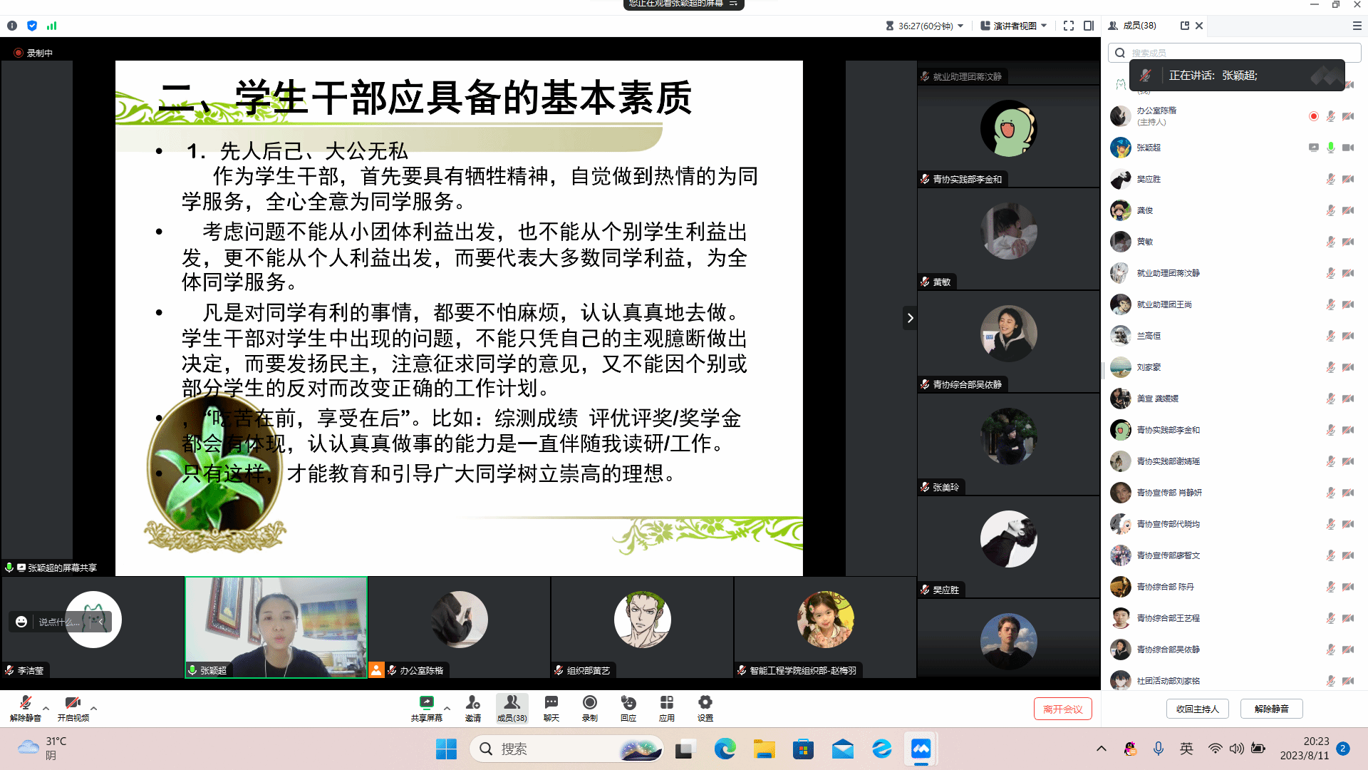 张颖超老师认为学生干部应具有安全意识、责任意识、团队意识、创新意识、服务意识、形象意识。张颖超老师强调智能工程学院的口号是智能工程,一路同行,我们的目标也体现在团结就是力量,在开展完满教育活动里(社团/艺术/体育/志愿),有创新的想法都可以落实到活动策划来进行。