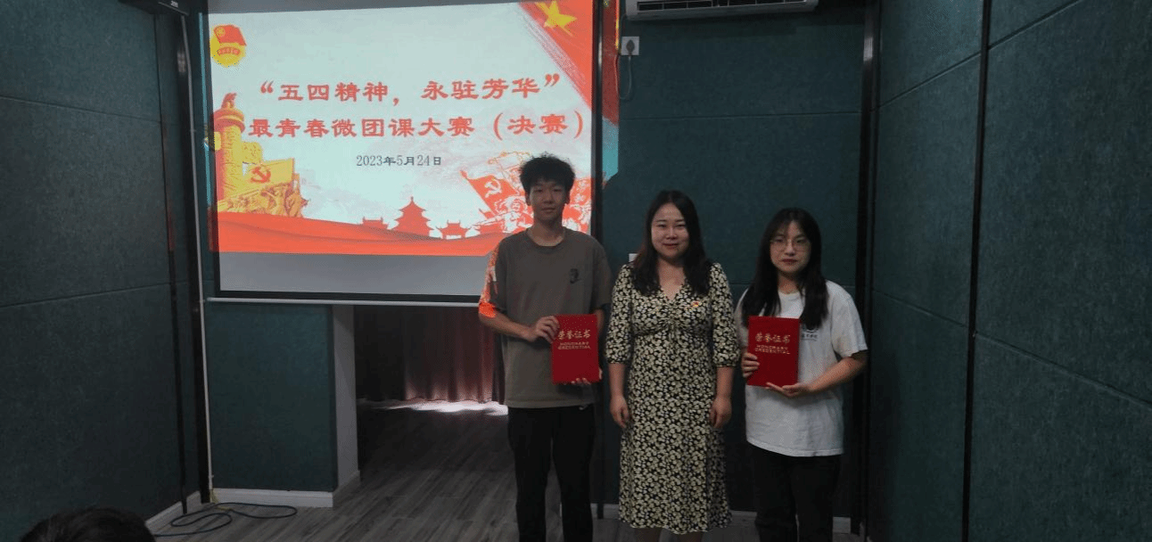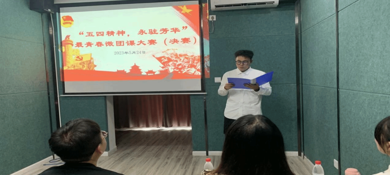五四青年品牌月是为了弘扬以爱国主义为核心的五四精神,并展现共青团员和青年学生朝气蓬勃的青春面貌,焕发青春绚丽光彩而设立的一系列活动。它旨在让广大青年将青春奋斗融入时代主题,通过担当中的历练和尽责中的成长,让青春在广阔天地中绽放。我院于2023年5月24日下午15:00至17:00在花果1408放映室组织了五四青年品牌月系列子活动——"五四精神,永驻芳华"最青春微团课大赛。这次大赛很荣幸地邀请到了马克思主义学院的唐菊相、毕毓璟、袁鑫三位老师作为决赛评委。