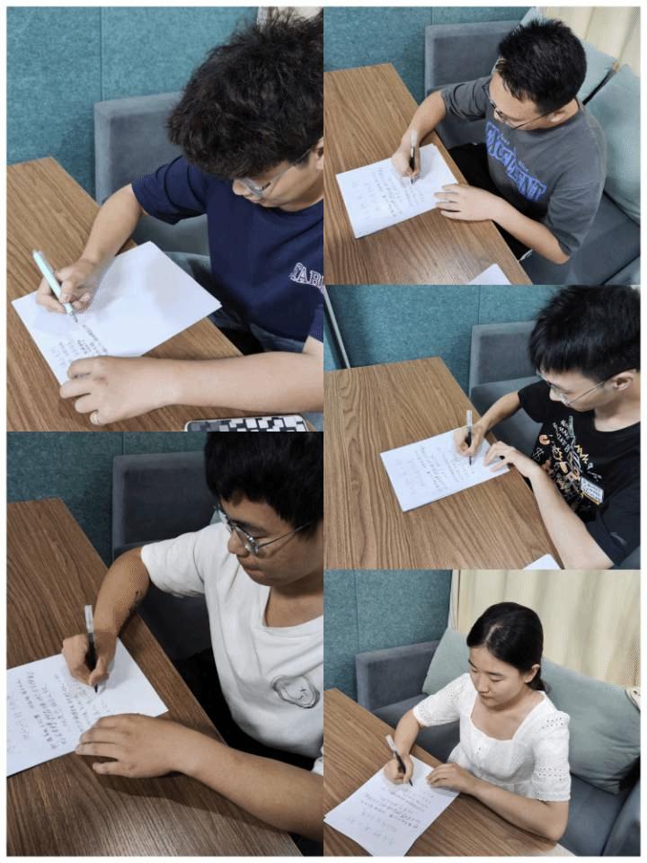 随后,在两个班的班长带领下,为同学们分发了纸条,用来书写防诈标语,看着同学们抒写的防诈骗的标语铺满了整个纸张,可知同学们对诈骗的内容是很全面的。