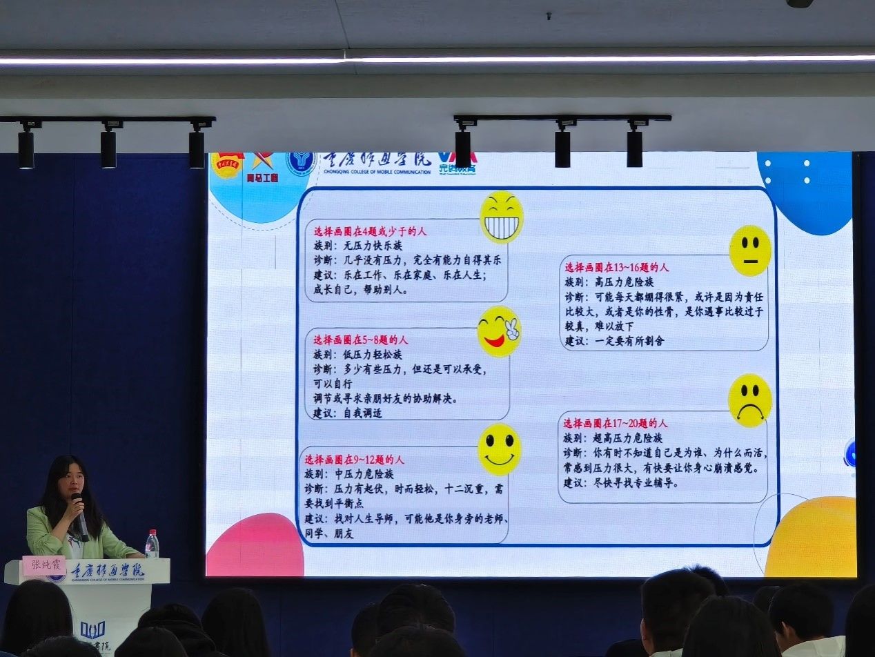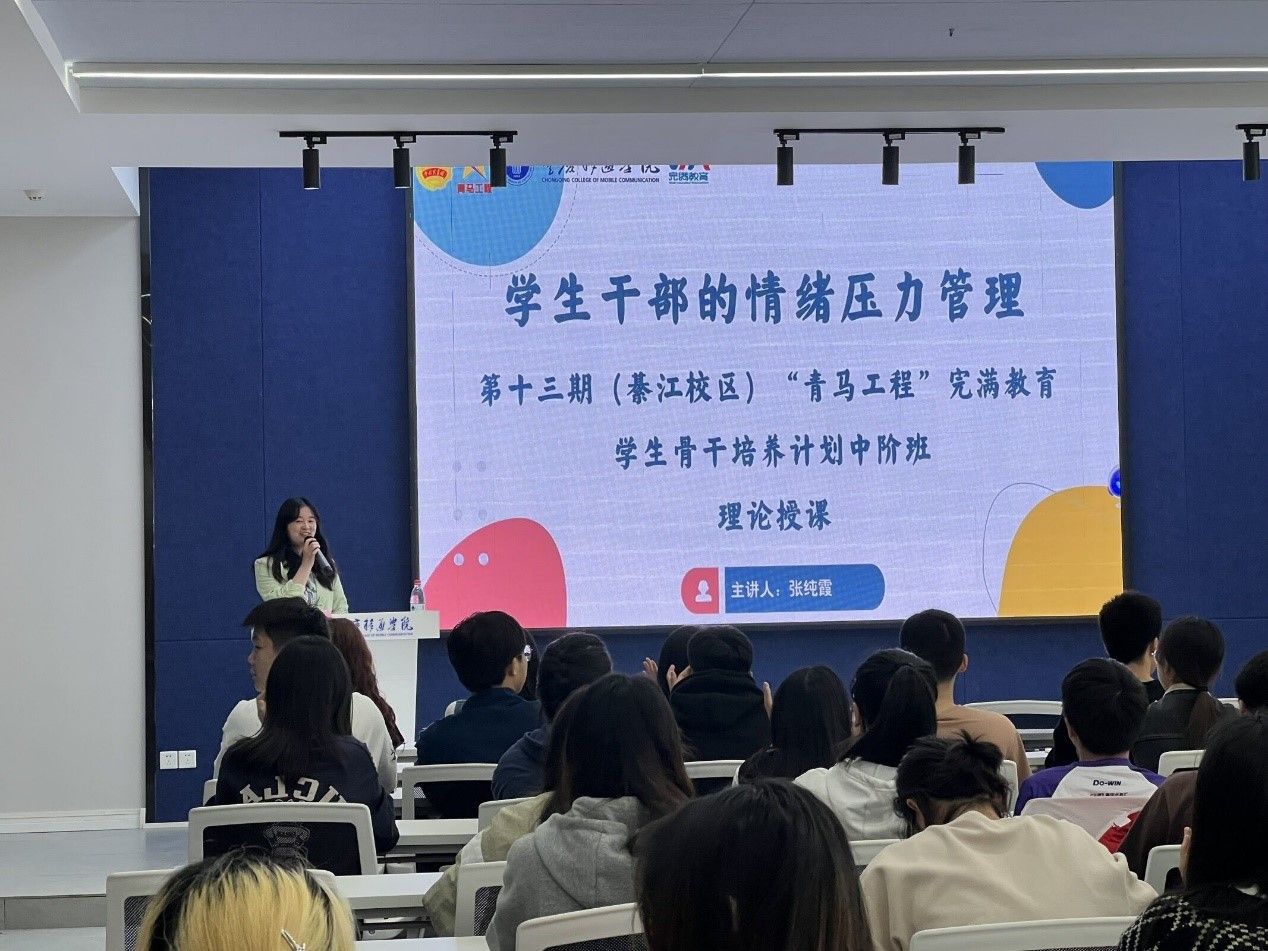 4月26日下午,为加强青马完骨计划中阶班全体学员心理健康教育,解决学生骨干在繁忙的学习工作中遇到的困惑和情绪问题,让他们学会在遭遇困难时及时地为自己进行心理上的自我疏导。校团委秘书部特邀我校心理健康教育与咨询中心专职教师、中科院心理咨询师张纯霞老师以“学生干部的情绪压力管理”为课程主题在綦河书院:观涛·多功能报告厅对青马完骨中阶班学员进行授课。