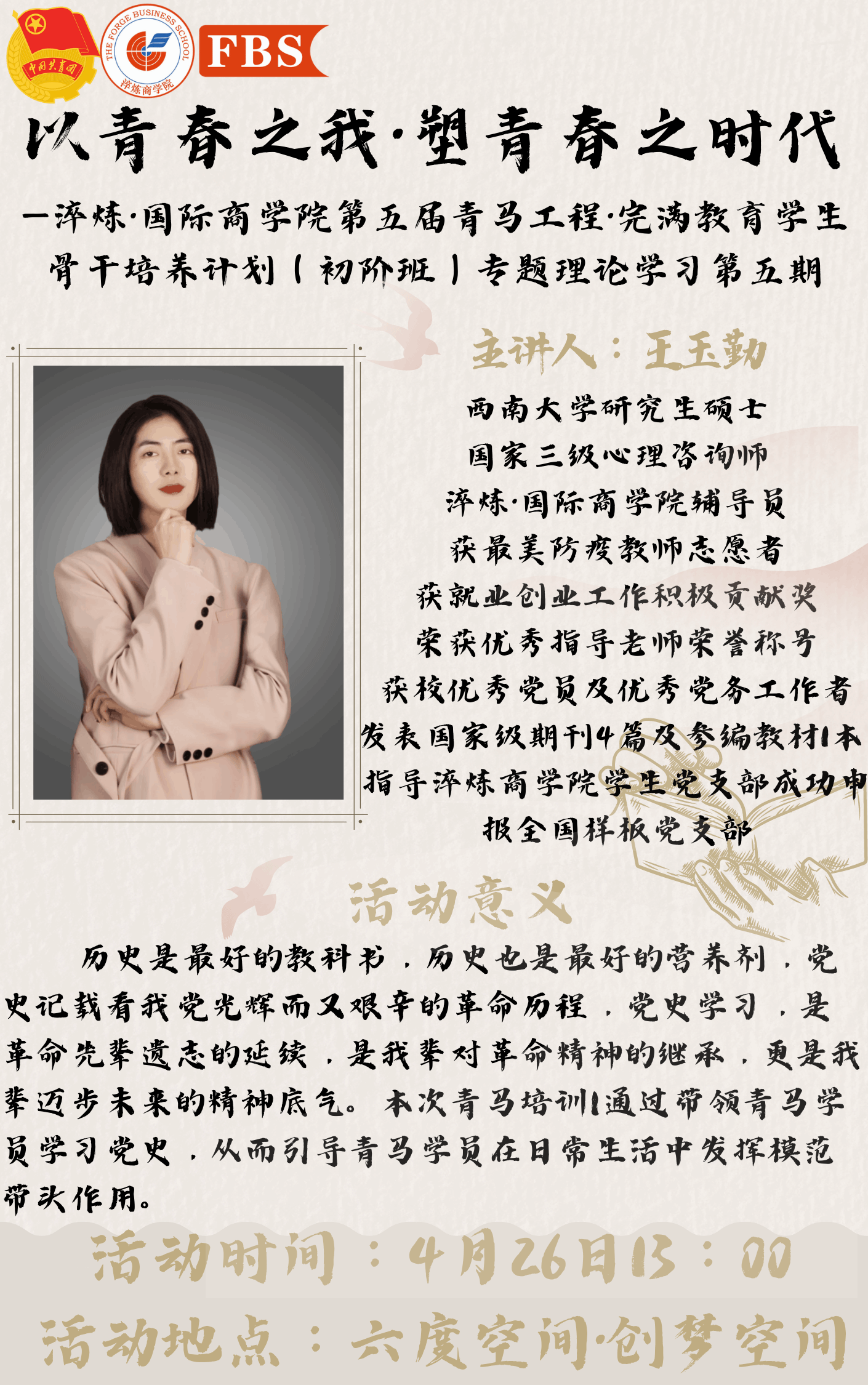 青春如初春,如朝日,如百卉之萌动。当代青年生逢其时,是党和国家事业发展的主力军。为了加强党史学习教育,提高青马学员思想理论水平和政治素质,做到学以明理,学以致用,从而推动青马学员在日常生活中发挥模范带头作用。淬炼•国际商学院团总支组织部于4月25日在六度空间举行了以“以青春之我·塑青春之时代”为题学生骨干培养计划(初阶班)专题理论学习第五期活动。