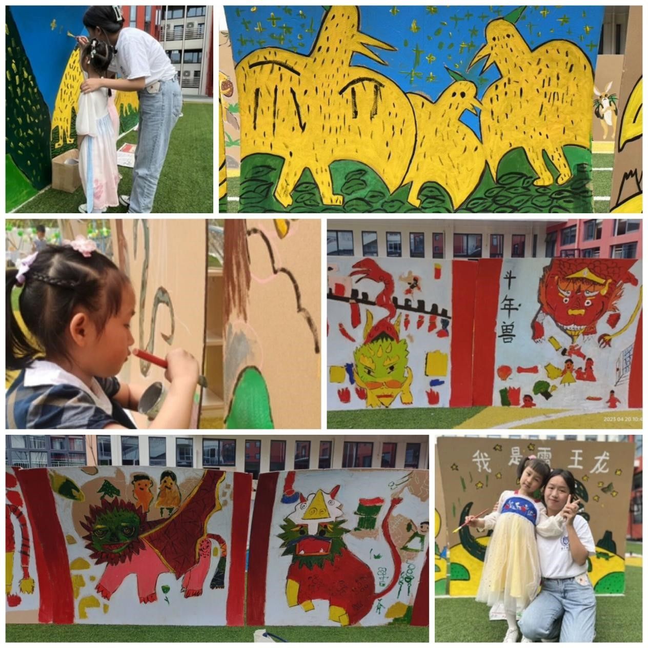 早在前一天,远景师生们前往新华幼儿园进行绘本创作,在长达十小时的时间里,师生们为小朋友们准备了2m*1.5m的50副分别关于“斗年兽”、“我是霸王龙”、“咕噜牛”、“丛林之王”、“美丽小兔”主题绘本。