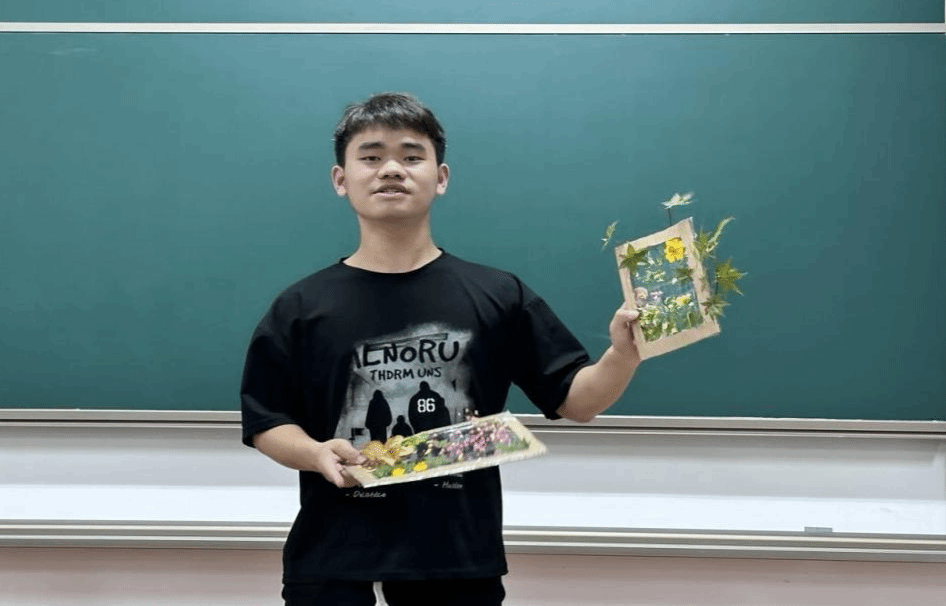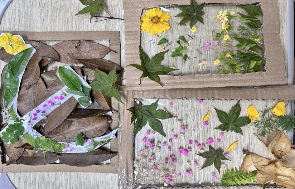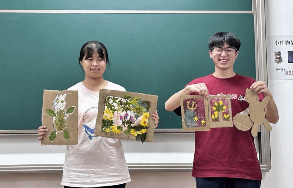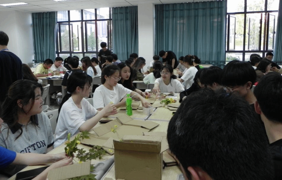 活动伊始,主持人向同学们讲述贴画的制作方法,并为同学们示范制作过程并展示成品。 在学习制作过程之后,同学们跃跃欲试,纷纷拿出提前准备好的纸板、花、树叶等材料,开始了以班级为单位的贴画创作。各班级成员踊跃商议着贴画的主题内容并分配任务,裁剪、绘图、粘贴一气呵成,大家都在全神贯注地完成自己的作品。时间消逝,在同学们的相互协作下,一幅幅作品呈现在大家面前。