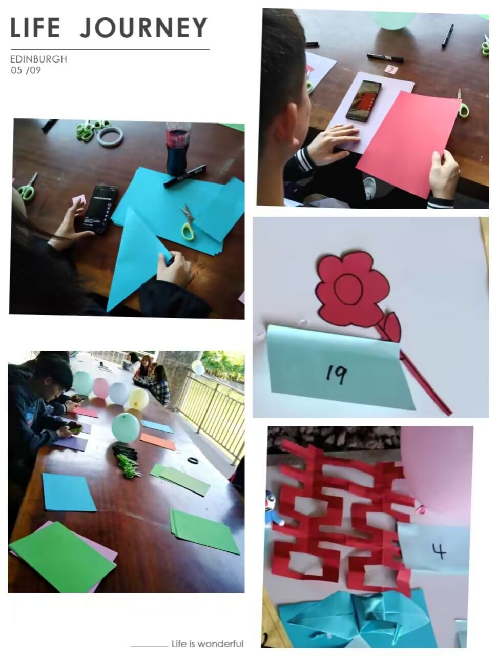 艺术源于生活,艺术点亮生活。折纸与自然科学相结合,用工具创造出诸多形态各异的图形,如对称的“囍”字、立体的“春”字。同学们拥有天马行空的想象力,动用双手创造无限乐趣。同学们按照心里的想法,把手里的卡纸裁剪成想要的图形,再在此基础上进行修剪,最后达到想要的成果。在此过程中,同学们充分发挥出了自己的想象力和动手能力,同时也提高了同学们自己的成就感。