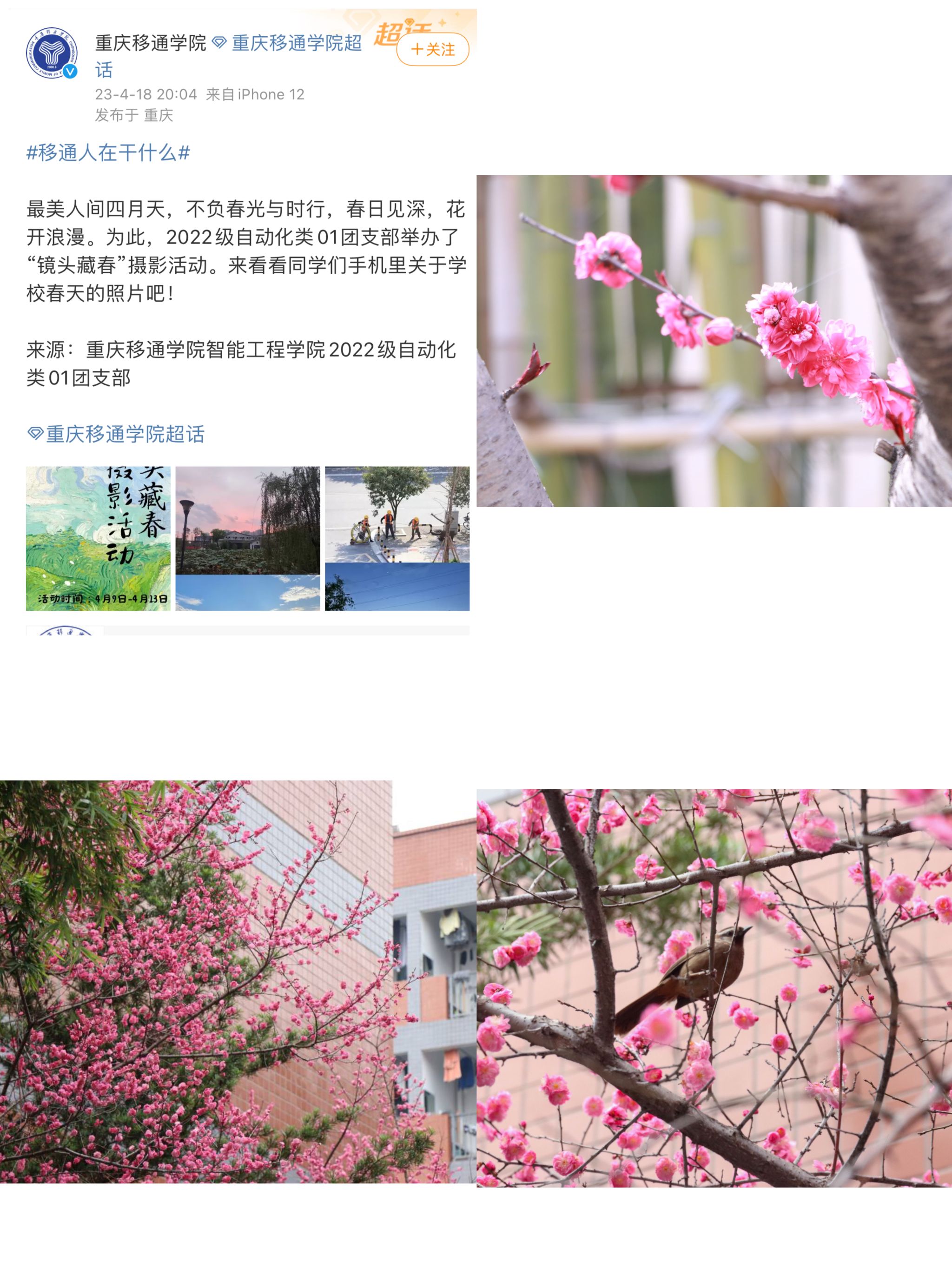 满园春风来,花开遍野间。寒冷的冬天已经过去,我们脱下厚重的外套,枯黄的草坪也冒出了新芽,柳树也开出了新叶,梅花也露出头,为了培养全校学生对摄影的兴趣,提高大家的摄影的摄影技术,拥有一双发现美的眼睛,同时丰富大家的课余文化生活,为大家营造轻松,快乐的学习氛围。鼓励大家走出宿舍,多出去走走,呼吸新鲜空气,感受春天的气息,捕捉春天的痕迹。重庆移通学院智能工程学院2022级自动化类01团支部于2023年4月9日到4月13日开展了“镜头藏春”摄影活动。