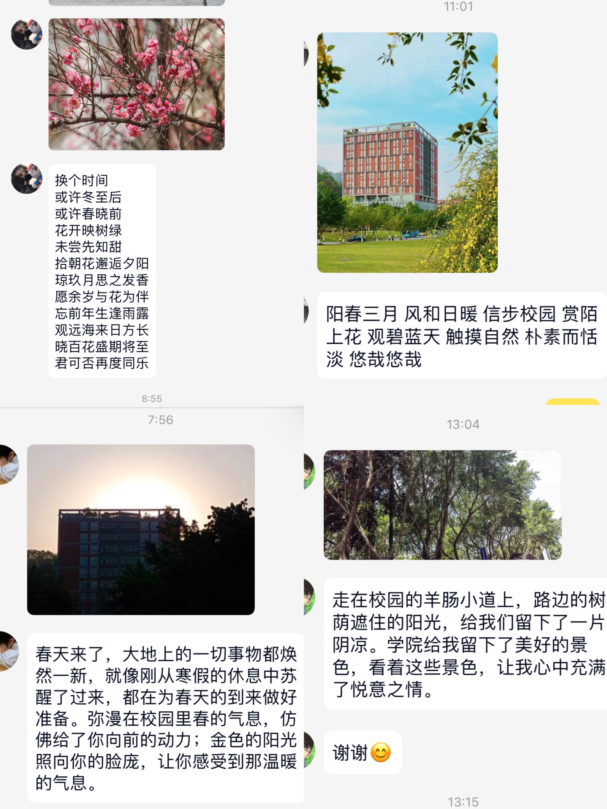 次日,同学们交给工作人员自己的摄影作品,并附上了自己的感想。看到大家发出许许多多美丽的照片,不禁让人感叹春天的美好,也为大家有一双发现美的眼睛而高兴。