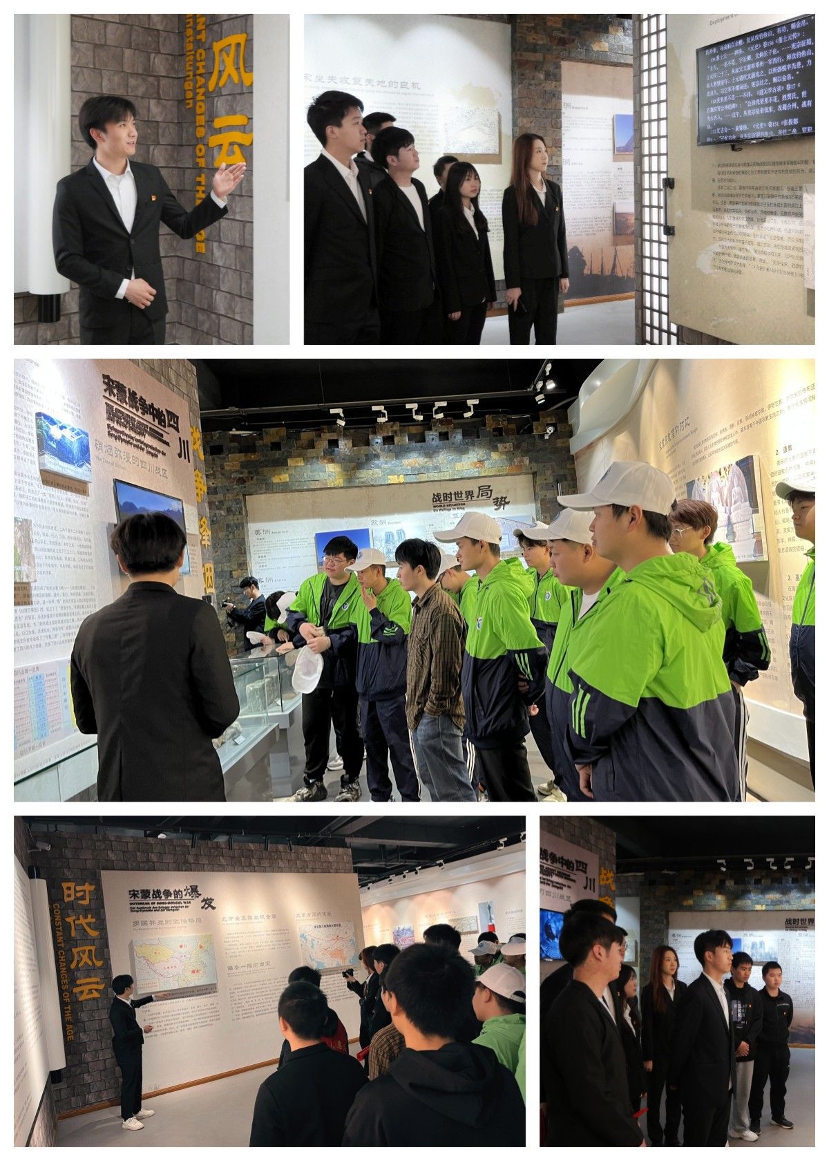 随后,全体同志们到达二楼展厅。智能工程学院学生第二党支部严俊辉同志作为讲解员,首先为同志们讲解了钓鱼城“军民”抗战36年历史渊源,强调了这场保卫战是中外战争史上罕见的以少胜强的典例。紧跟他的步伐,严俊辉同志对墙壁上大蒙古国的领域图进行了分析,梳理了成吉思汗进行大规模战争的时间线。最后,他通过宋蒙战争中四川战区防御体系建立、钓鱼城的战略地位等对“战争烽烟”板块进行了解说。并以提问互动的方式道出了余玠在两年中初步建立了震惊中外的“以山为点,以江为线,点线结合,网状分布”的山城防御体系。