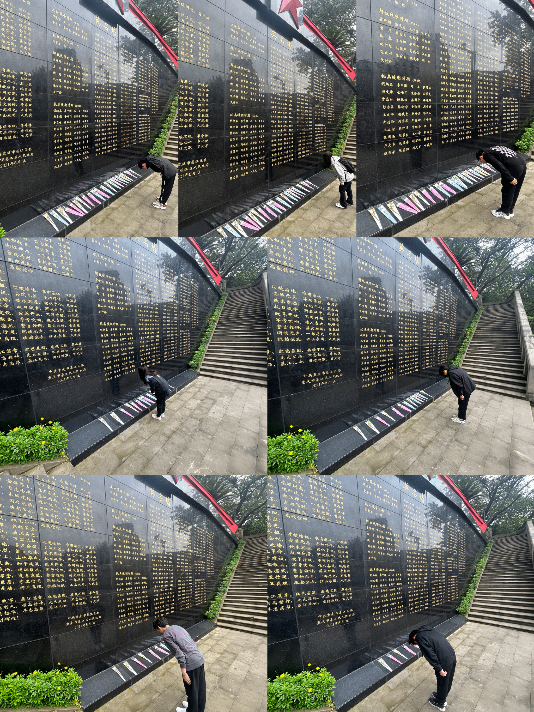 同学们井然有序地上去献出自己的一份鲜花,并对着英名墙深深地鞠了一躬,表达出自己对革命先烈们的尊敬和缅怀之情。
