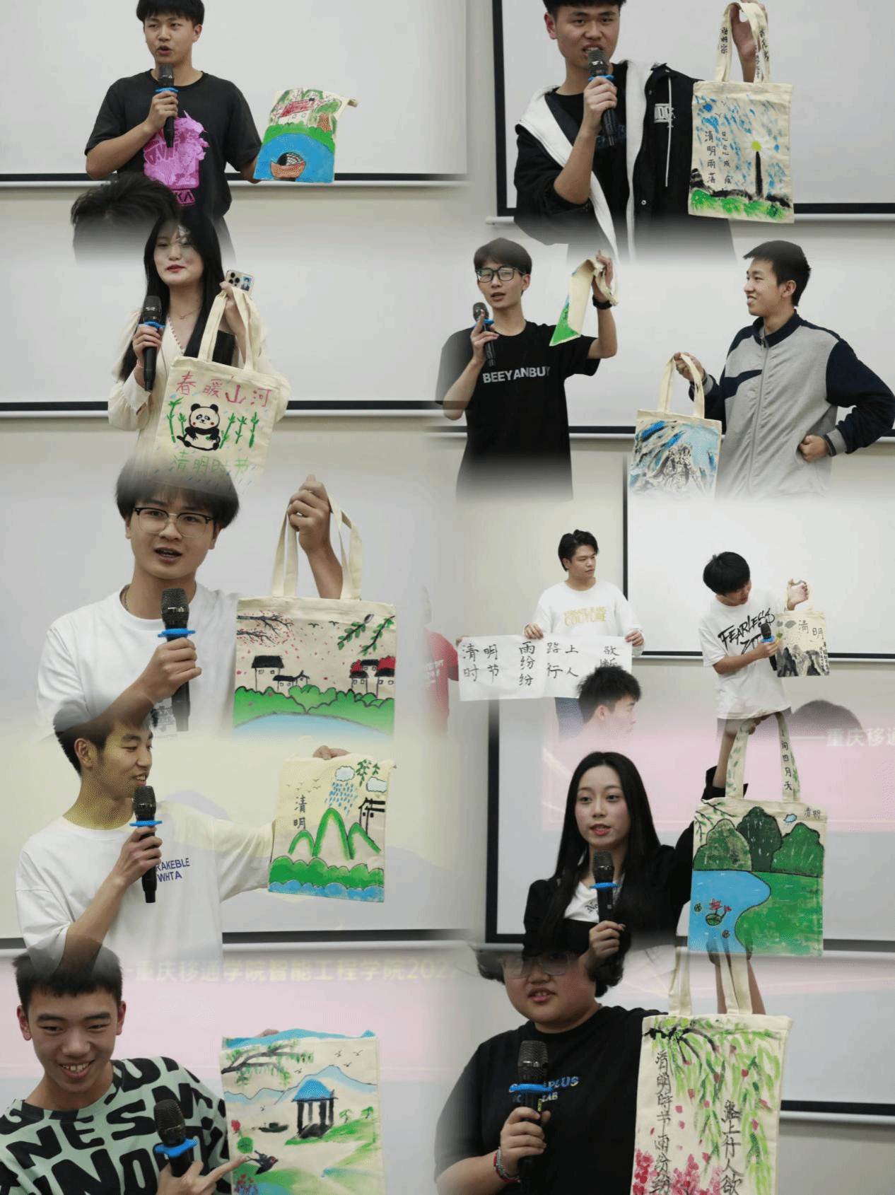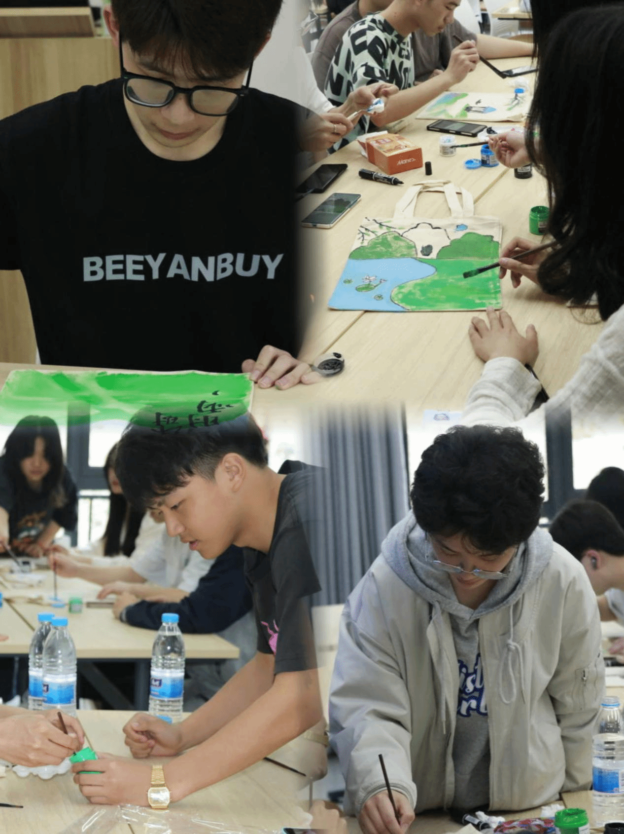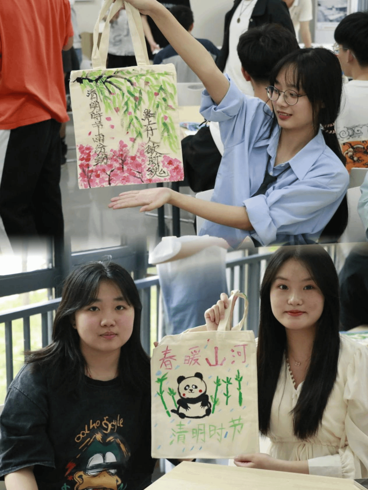 活动一“青柳之情”通过绘画的方式,在颜色的引导下唤起同学们自己内心中的清明节景色,随着裁判宣布绘画开始,一小时倒计时也随即使同学们的脑袋快速转动。在颜料和思维的碰撞下,空白的帆布袋上出现了一抹抹动人的色彩,一幅幅精美的图画慢慢呈现在大家的眼前。