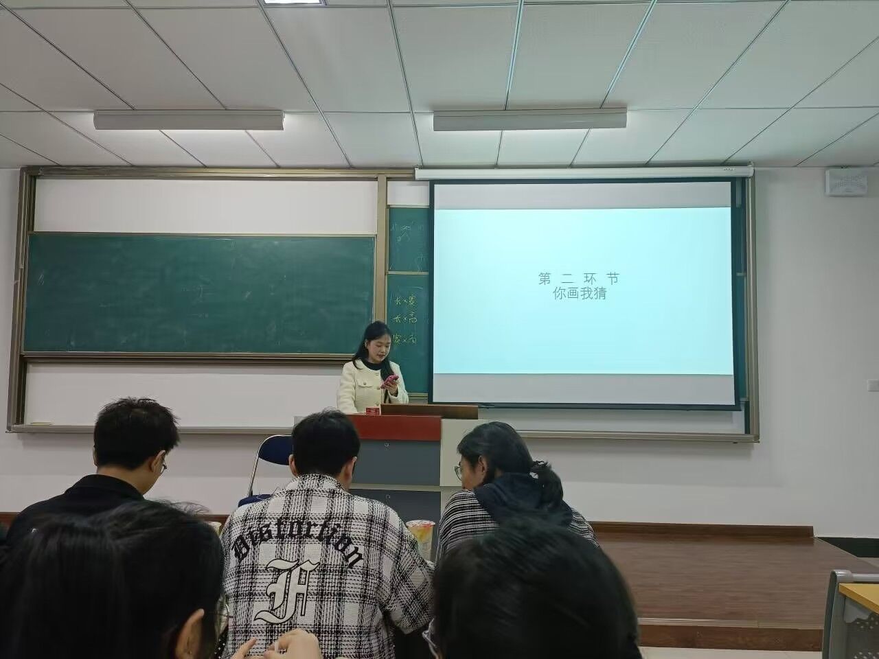 第三个活动“你画我猜”,两人一组,自行组队,主持人提供有关书籍经典片段的场景题目,参赛队伍默契大比拼,需在5分钟之内,以一人绘画,一人猜的形式进行答题。现场氛围极其热闹,参赛人员摩拳擦掌,画的画,猜的猜。有些参赛人员画的千奇百怪,逗得现场的老师同学捧腹大笑,也有些参赛人员,答案呼之欲出但迟迟猜不对。活动极具趣味,老师也称赞道同学们很有想象力。