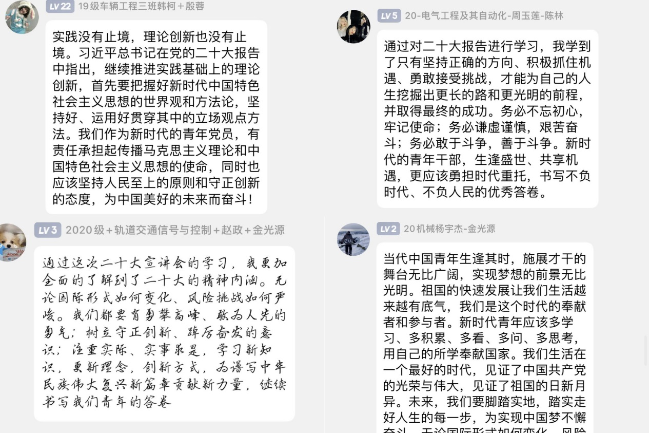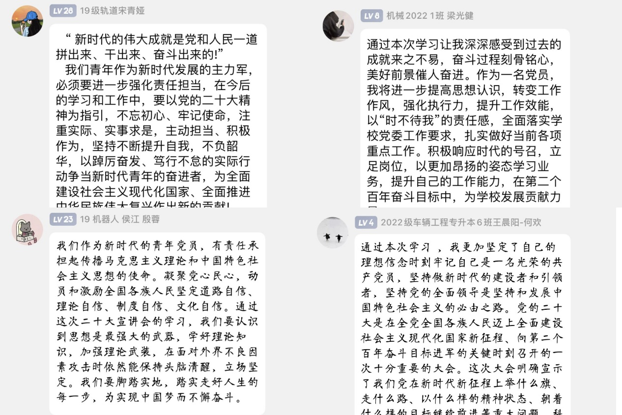 在此次宣讲活动中,智能工程学院党支部成员认真的学习了党的二十大精神,并对我国目前的政策和国情有了更加深刻地了解。通过此次二十大宣讲的主要学习,支部成员写下了对此次二十大宣讲活动的感受,大家纷纷表示,作为新时代青年,必须肩负起历史使命,做敢于斗争、善于斗争的模范,带头迎难而上、攻坚克难。