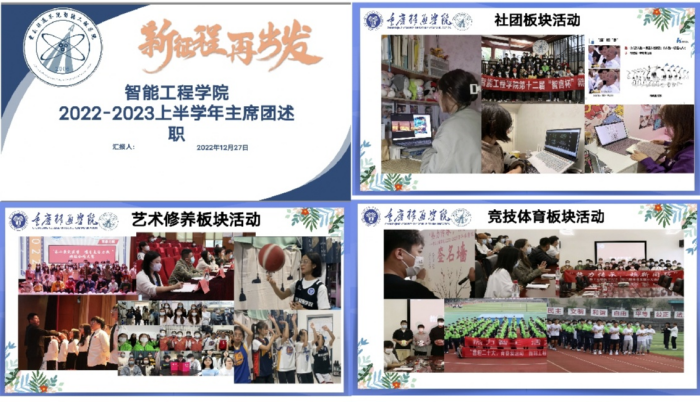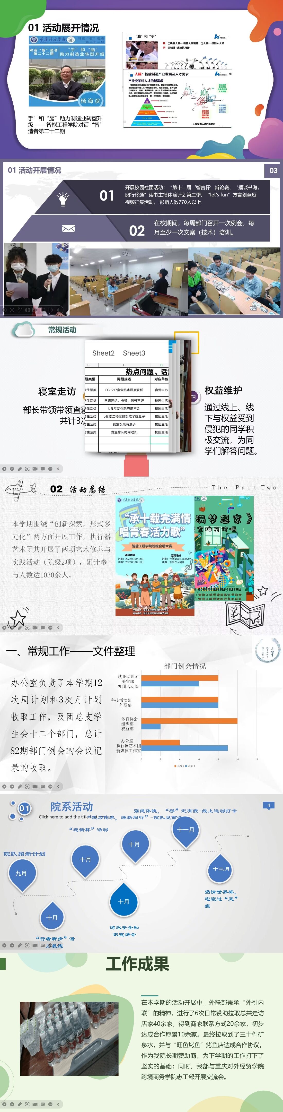 大会第一项,由智能工程学院学生会主席团代表做综合性数据展示和归纳,以清晰明了的表格呈现本学期学生会主席团及各部门工作情况。