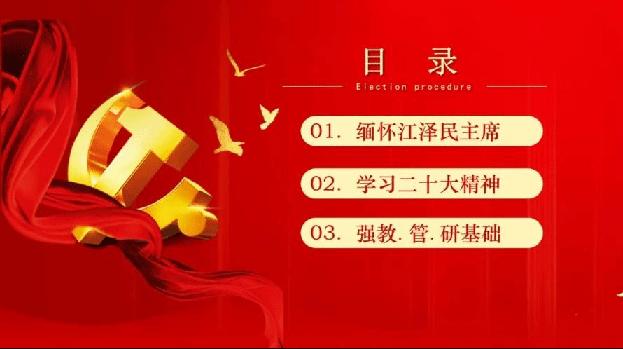 会议第一部分,缅怀江泽民主席。江泽民同志是我党我军我国各族人民公认的享有崇高威望的卓越领导人,伟大的马克思主义者,伟大的无产阶级革命家、政治家、军事家、外交家,久经考验的共产主义战士,中国特色社会主义伟大事业的杰出领导者,党的第三代中央领导集体的核心,“三个代表”重要思想的主要创立者。潘书记组织学习《告全党全军全国各族人民书》《江泽民伟大光辉的一生》等文章,共同追忆江泽民同志伟大光辉的一生,要求全体教师、党员要化悲痛为力量,在新征程上更加紧密地团结在以习近平同志为核心的党中央周围,深刻领悟“两个确立”的决定性意义,增强“四个意识”、坚定“四个自信”、做到“两个维护”,自觉在思想上政治上行动上同以习近平同志为核心的党中央保持高度一致。苦干实干做出新成绩。
