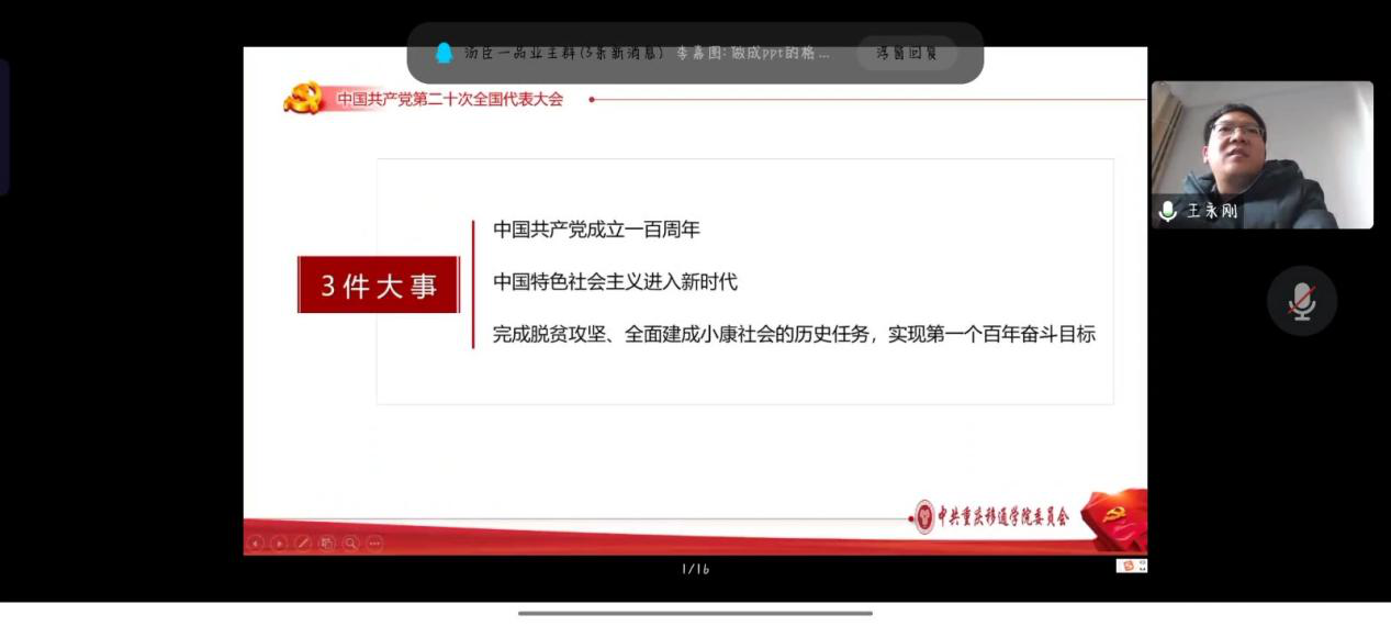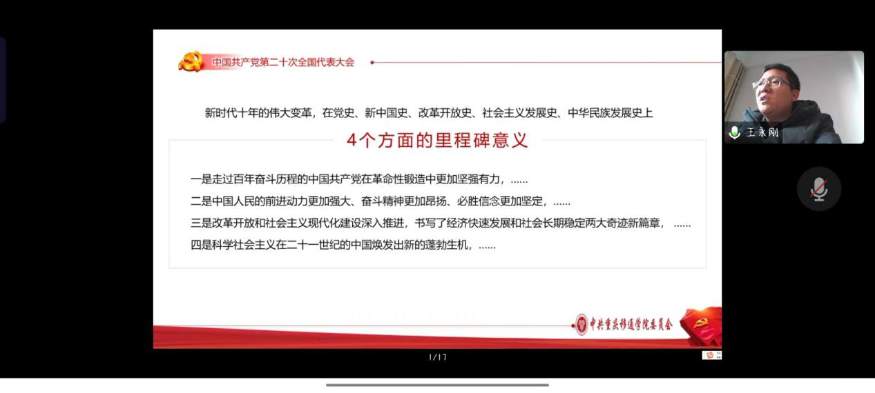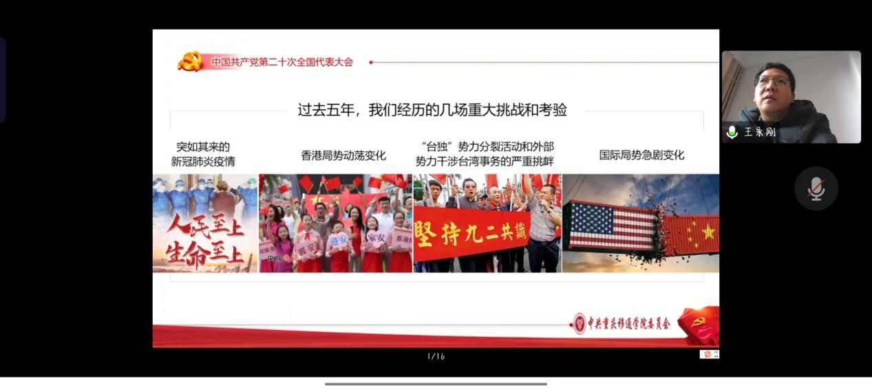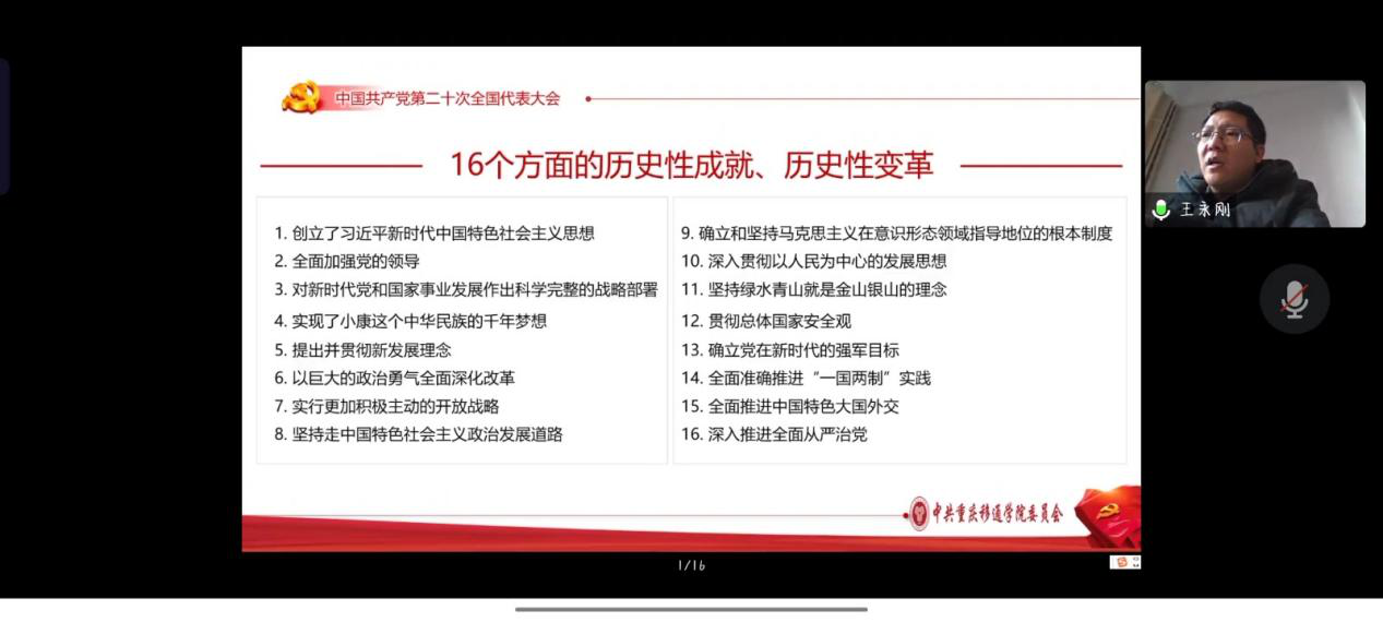 为学习宣传贯彻党的二十大精神,引领同学们坚定不移听党话、跟党走,肩负起时代赋予的重任,我院于2022年12月21日上午10:00在腾讯会议开展了党的二十大精神“进校园”宣讲第四网格专场,主讲人为学校党的二十大精神进校园宣讲分队副队长、学校副校长王永刚,主持人为数字经济与信息管理学院党总支书记、院长潘显兵,参会人员为学校财务处、图书馆及数字经济与信息管理学院师生党员代表。会议上王永刚副校长从党的二十大主题、回顾过去五年的工作和新时代十年的伟大变革、马克思主义中国化时代化、坚持党的全面领导和全面从严治党等七个方面对党的二十大提出的重要思想、重要观点、重大战略、重大举措作了全面系统阐述和讲解。