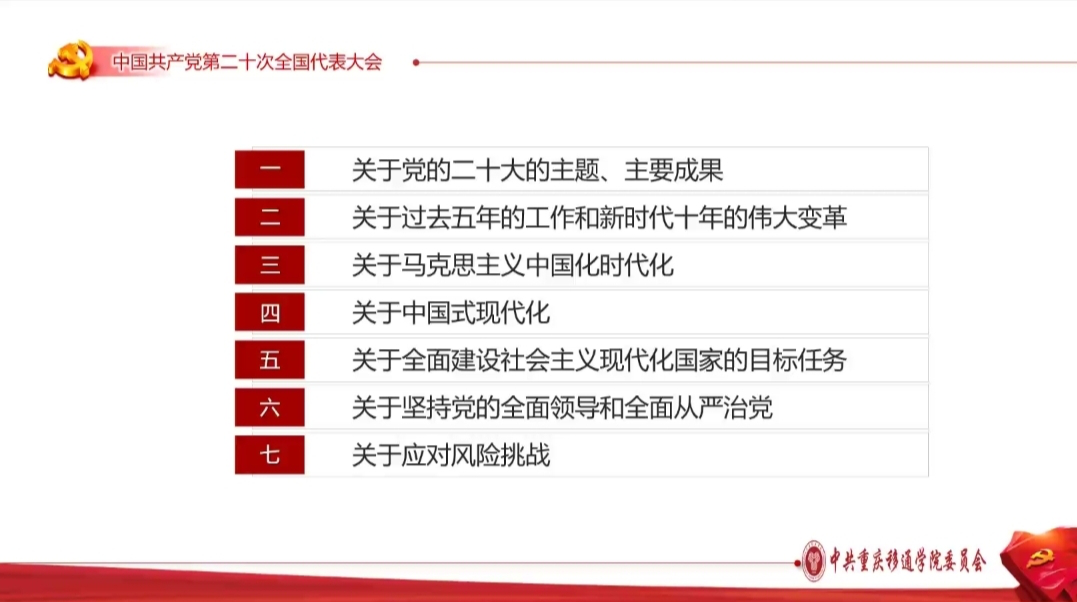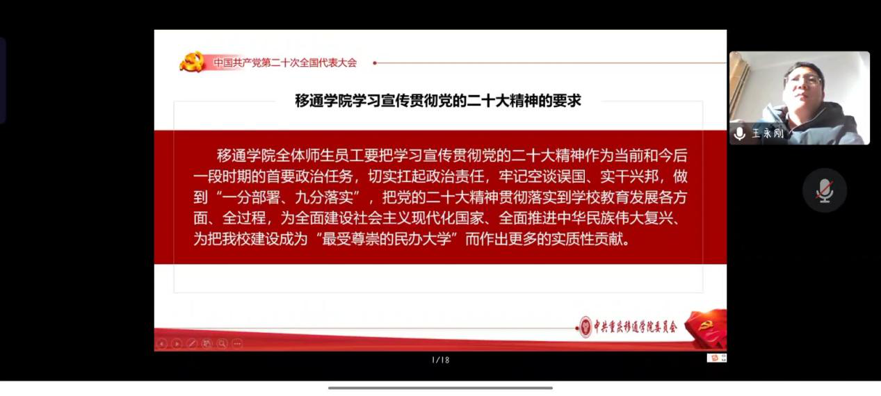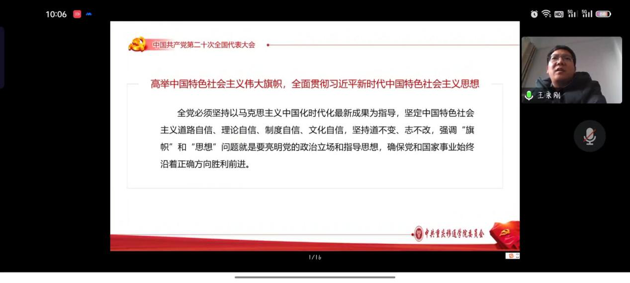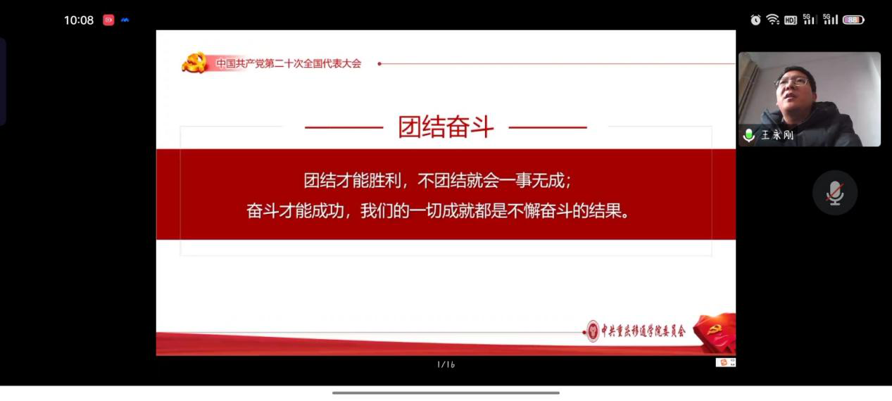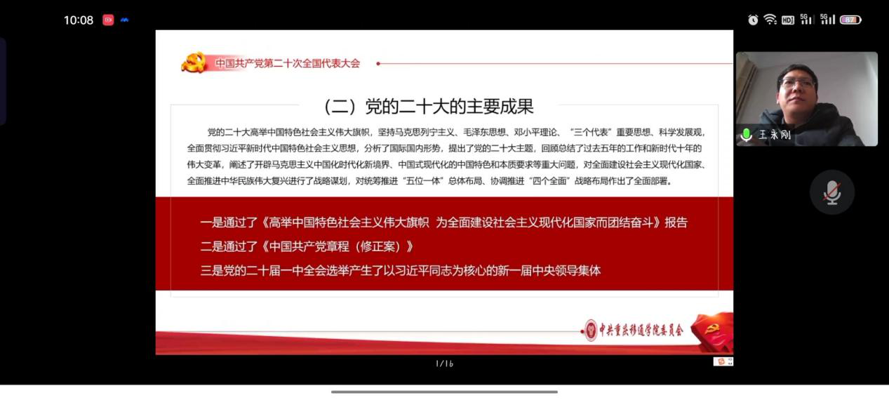 为学习宣传贯彻党的二十大精神,引领同学们坚定不移听党话、跟党走,肩负起时代赋予的重任,我院于2022年12月21日上午10:00在腾讯会议开展了党的二十大精神“进校园”宣讲第四网格专场,主讲人为学校党的二十大精神进校园宣讲分队副队长、学校副校长王永刚,主持人为数字经济与信息管理学院党总支书记、院长潘显兵,参会人员为学校财务处、图书馆及数字经济与信息管理学院师生党员代表。会议上王永刚副校长从党的二十大主题、回顾过去五年的工作和新时代十年的伟大变革、马克思主义中国化时代化、坚持党的全面领导和全面从严治党等七个方面对党的二十大提出的重要思想、重要观点、重大战略、重大举措作了全面系统阐述和讲解。