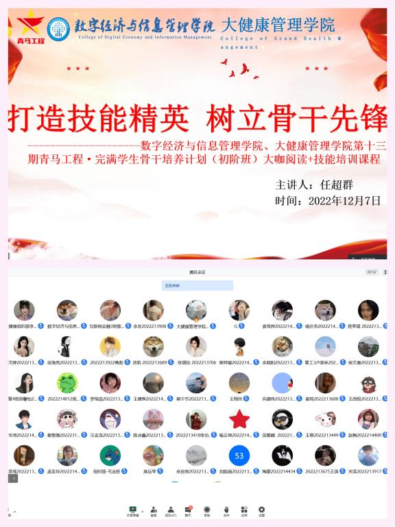人才有高下,知物由学。新时代的青年正处于学习的黄金时期,对知识和技能的渴望就如海绵汲水,在学习的过程中不断前行,不断追求实践。为更好的让青马学生骨干学习知识、掌握过硬的本领,数字经济与信息管理学院&大健康管理学院于12月7日下午13:00在腾讯会议线上开展“打造技能精英·树立骨干新风”—数字经济与信息管理学院&大健康管理学院第十三期“青马工程”完满教育学生骨干培养计划(初阶班)大咖阅读&技能培训课程。