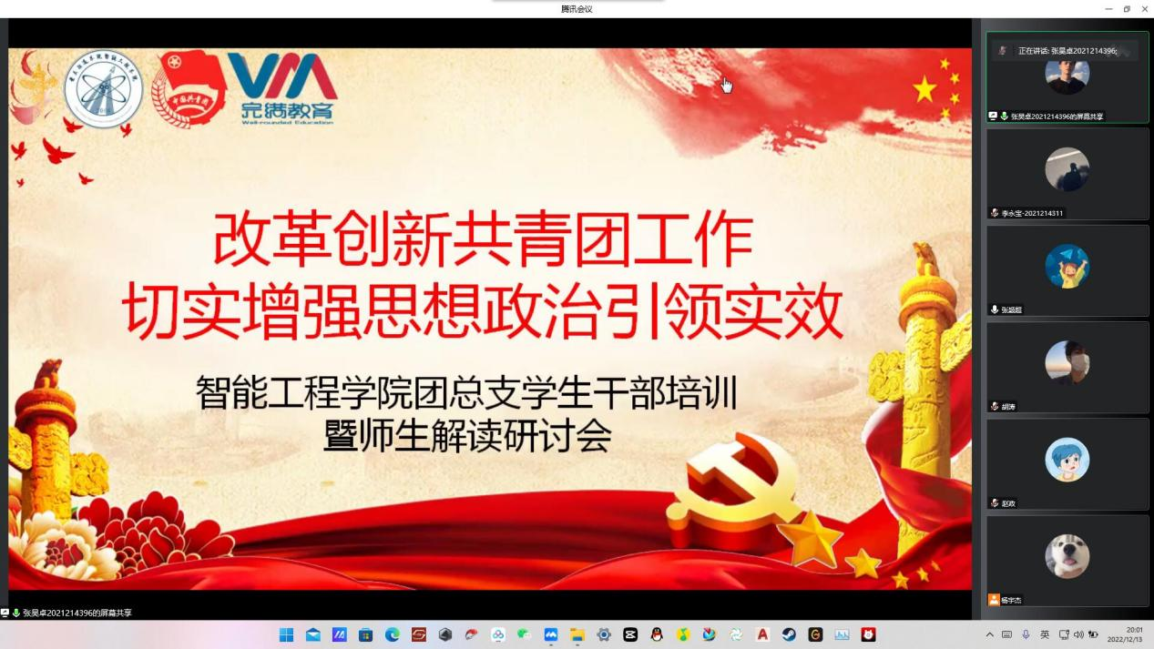 本次会议由智能工程学院团总支书记张颖超老师为干部们做讲解,智能工程学院团总支全体学生干部参与了本次线上会议。