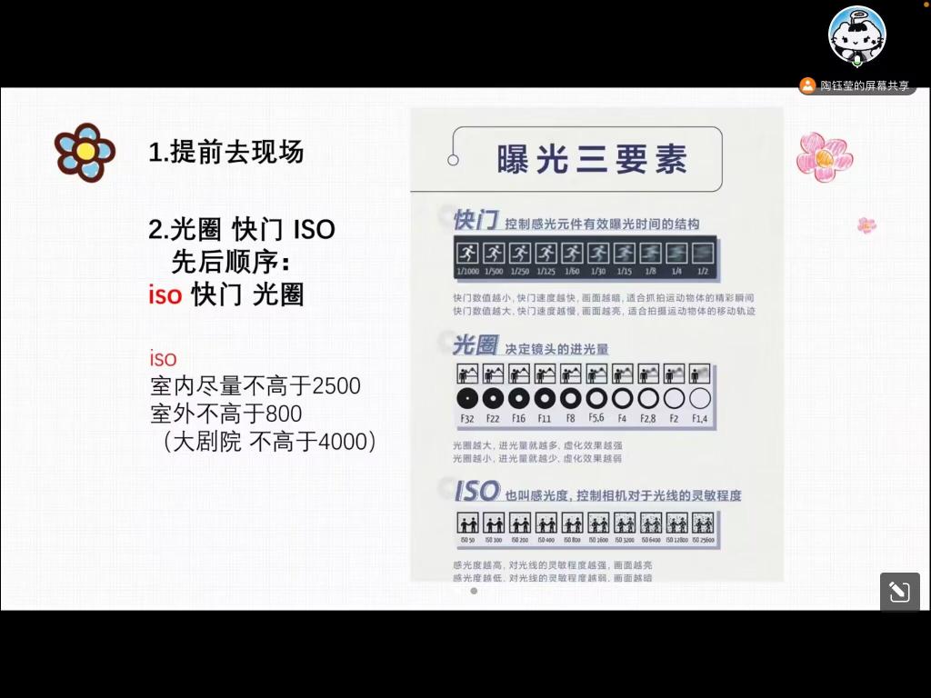 宣传调研部干部陶钰莹用往期干事们拍摄的照片为例,对相机光圈、ISO、快门的使用过程,以及常犯的问题进行讲解。针对干事拍摄照片画面整体偏暗的问题,陶钰莹以此为例,讲解了如何调整画面明暗问题。一是可以调节相机的光圈,快门的参数值;二是通过外力因素来改变画面明,暗的问题,例如通过开关灯,改变环境。
