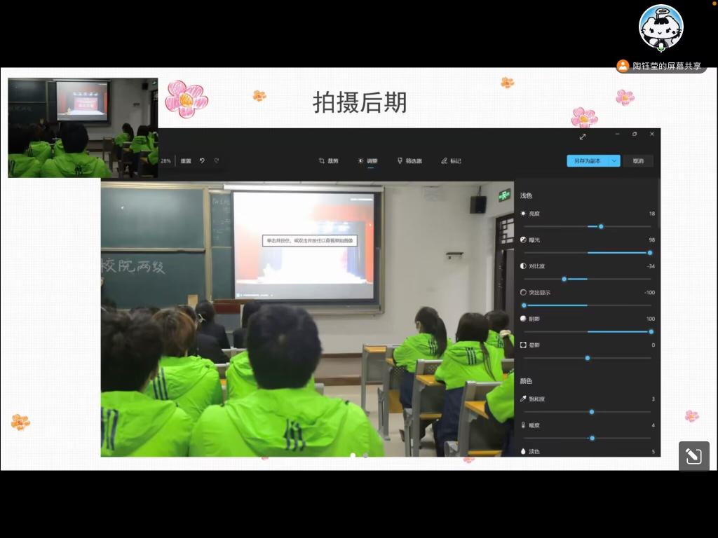 在拍摄后期的过程中,陶钰莹提到可以进行二次构图。如果前期的照片在表意上差点意境,可以通过后期来拯救。但是她也特别强调画面要真实,像活动照片之类的不需要很复杂的调色创作,以真实为主。最后,她建议同学们可以多去看看优秀的照片,以提高审美。在拍摄过程中尽量多拍,形成视觉冲击,总能抓住想要的瞬间想要的照片。