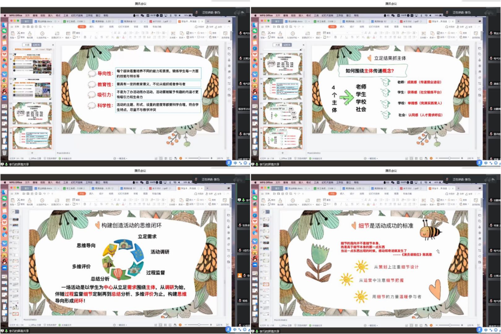 活动伊始,李巧老师通过提问的方式对我校特色完满教育工作四个板块做了回顾,以“兴趣培养,能力提升,专业融合”开展的社团活动,为每一名学生提供了一个展示交流的平台,提高了学生参加各种社团活动的积极性。丰富多彩的社团活动进一步提高了学生的综合能力,开阔了学生的眼界,陶冶了学生的情操。以“支队建设,项目品牌打造,志愿精神培育”开展的志愿服务工作,为新时代的志愿服务注入了新的生机和活力,对于学院的志愿活动还处于求新探索的阶段,李巧老师鼓励大家多学习多开展此类活动。以“健康体魄,阳光竞技,精神培养”开展的竞技体育工作值得继续培养,继续做好体育示范院系的带头作用。围绕艺术工作主要从“审美与鉴赏,创造与展示,引领与传承”三个方面进行活动内容的挖掘,做好传承与融合。