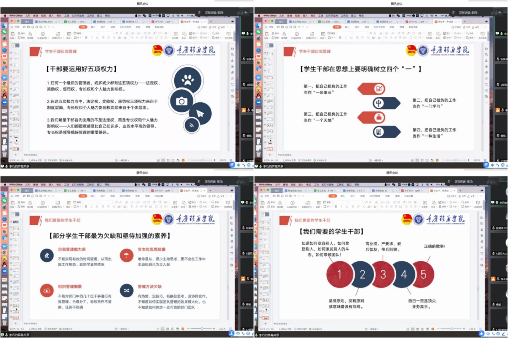 随后李巧老师提出要明确学生干部的身份,将政治定位作为枢纽,立足岗位实干,学生干部要具有代表性,引领性,充分发挥自己的职能与责任,做到学生干部应有的责任和义务,对于能力的提升沟通交流是必不可少的,语言是互动,循环,沟通的艺术,它是需要流动的,流动也就意味着,共情和转化。我们要学会共情,不仅要在生活中做到共情,在工作中共情也十分重要,只有学会站在他人角度想问题,予他人所需,才能将工作更好的进行,才能正真掌握语言表达的艺术。