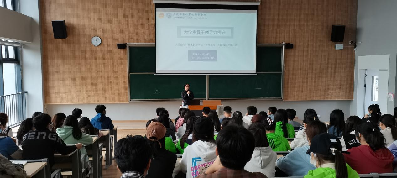 为进一步提升我校学生大学生骨干领导力,引导青年展现担当作为,凸显我校学子积极向上的精神面貌,进一步推动移通学子成为有理想、敢担当、能吃苦、肯奋斗的新时代好青年。2022年11月25日13:00,大数据与计算机科学学院团总支组织部在横山阶梯教室开展了“青马工程”完满教育学生骨干初阶班理论培训第二讲,此次特别邀请了学工办主任阙小梅老师为青马班学员做主题授课,带领青马工程全体学员参与培训。