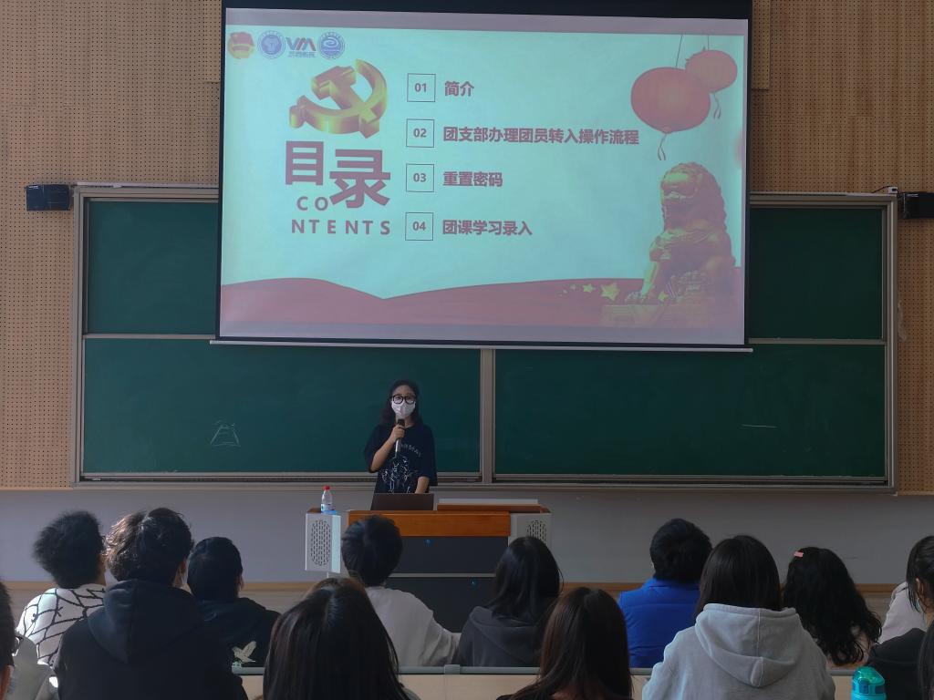 唐李韦分别从智慧团建简介、团支部办理团员转入的具体操作操作、支部内所属团员重置密码的操作以及团课学习的录入四个板块展开的。在培训中讲到“智慧团建”也称共青团智慧团建,能够提供共青团的工作动态、团员账号注册、消息推送、在线调查、在线学习、互动交流、团员活动签到、团费查询、活动登记等功能。其中,唐李韦向各班团团支部书记们讲解了智慧团建系统的具体操作流程并强调团支书的工作是支部文化建设的重中之重。