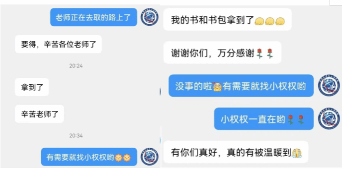 权益信箱收到了同学的书包和书落在了图书馆,因疫情原因无法拿到的消息后,为了不影响学生的线上课程,小权权第一时间进行反馈并以最快的速度解决了问题。志愿者老师帮同学取回教材和书包,解决了燃眉之急。