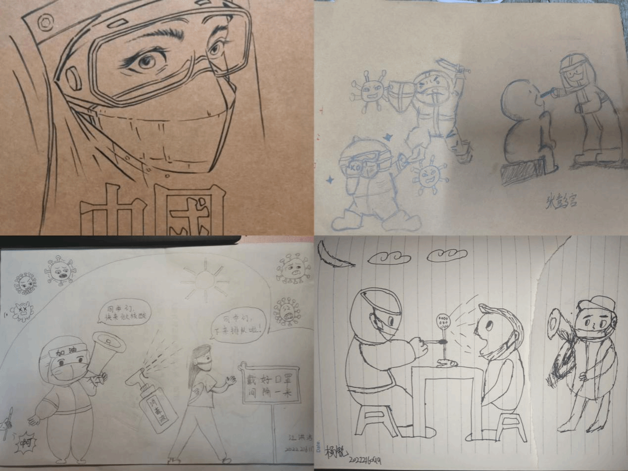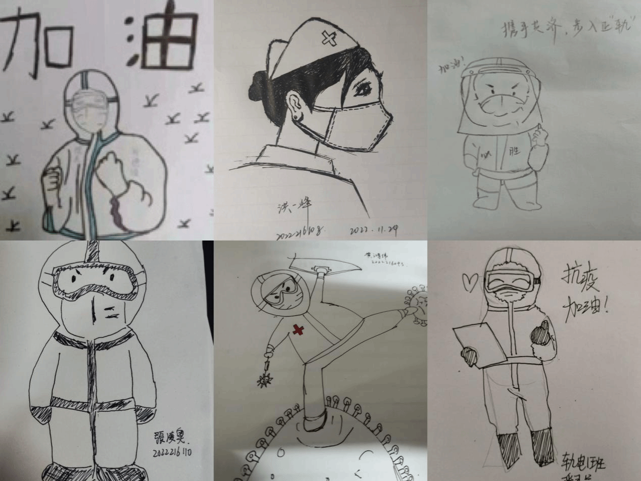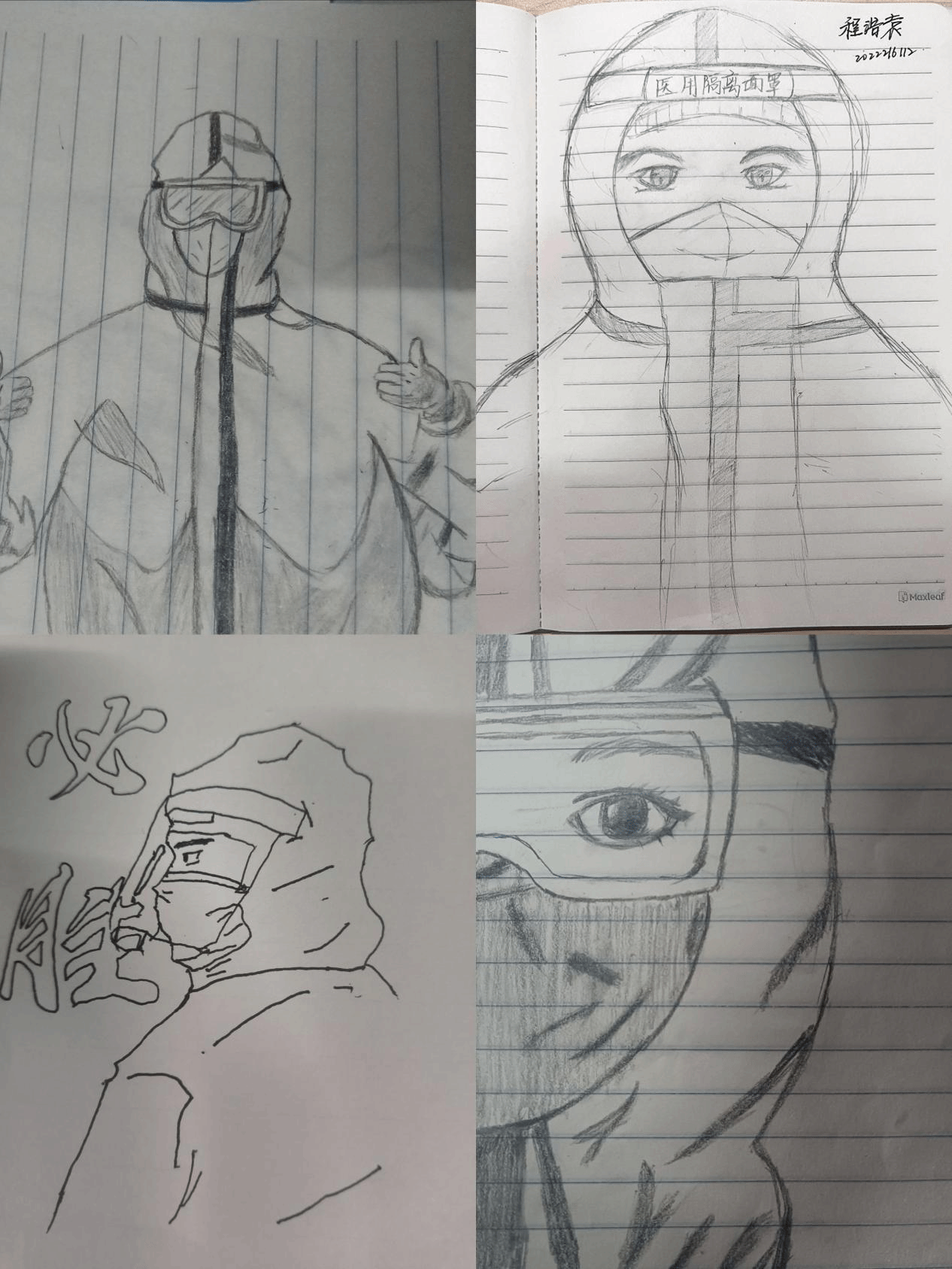 那一个个奔走的身影有我扪的见证,也有我们记录。画出他们最美的模样,那一个个或可爱,或疲惫,或憨憨但同样美丽的大白们,同学经过细心的观察,长久的构图,在不同的载体上绽放那些寒冬的腊梅们,诉说遥远而近在咫尺的欣喜与甜蜜。当心中模糊的身影在纸面构矩成形,当心中的美好填满画卷,那便是思维的解封,是创意冲破囚笼的释放。