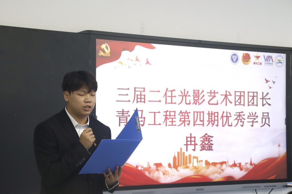 首先,第四期“青马工程”完骨班优秀学员代表,现任艺术传媒学院光影艺术团团长冉鑫同学发言。他在发言中讲述自己在大学成长的经历,从上台讲话发抖到对活动现场完全掌控,在完骨班里不断脱变。他总结到,“学生骨干其实是一个短期目标,是一种方向,是进入陌生环境时迷茫的一座“灯塔”。要想成为一位合格学生骨干,必须不害怕做事,要脚踏实地办事,明确自身任务和努力方向,清楚自己的职责,努力提高自己的组织管理能力,严守纪律,从小事做起。时刻保持一颗责任心,不管遇到任何事情都坚守本心”。