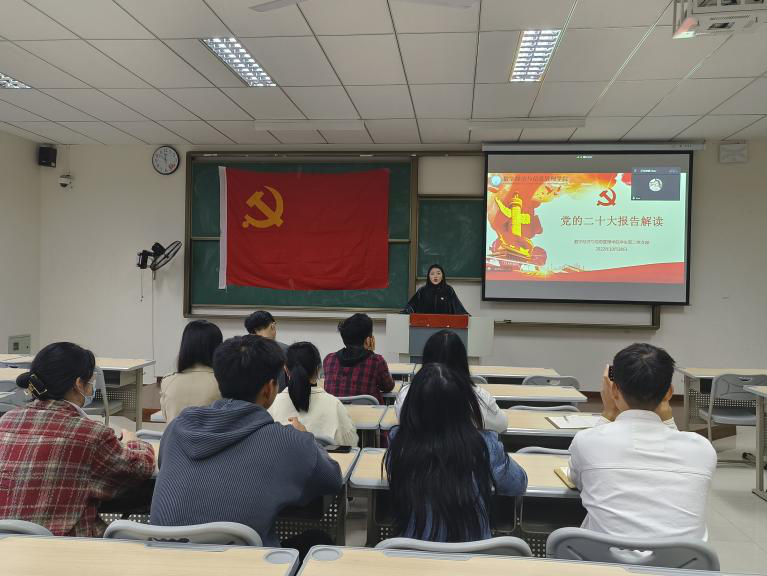 为深入学习党的二十大工作报告,全面解读报告内容、深入宣传党的二十大报告精神,数字经济与信息管理学院学生第二党支部于10月28日16:00在双栀201召开2022年10月主题党日活动,会议由学生第二党支部书记王瑞老师主持,支部全体党员参加会议,因疫情防控,本次会议线上线下同时开展。