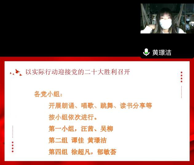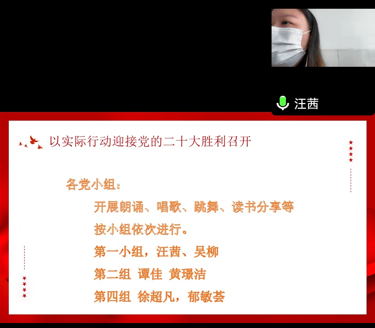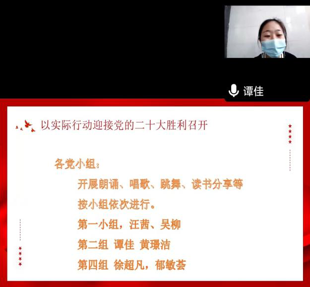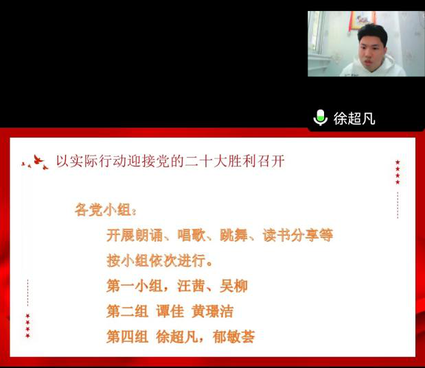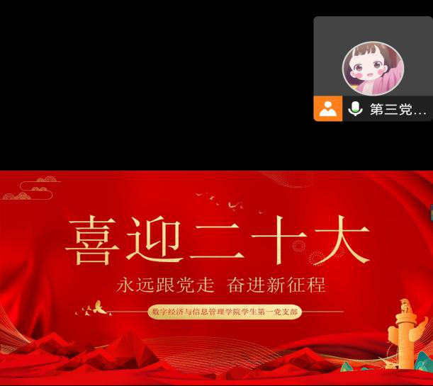 回望过去信心百倍,展望未来豪情满怀。金秋十月,历史的时针又指向一个重要时刻,中国共产党第二十次全国代表大会即将召开。为喜迎党的二十大胜利召开,充分发挥党员先锋模范作用,强化广大党员同志的政治品格,赓续红色血脉。数字经济与信息管理学院学生第一党支部于10月14日开展“喜迎二十大、永远跟党走、奋进新征程”线上主题党日活动。此次主题党日活动,通过开展朗诵、读书分享等多种活动形式引导广大党员以史为鉴,开创未来,迎接即将到来的二十大。